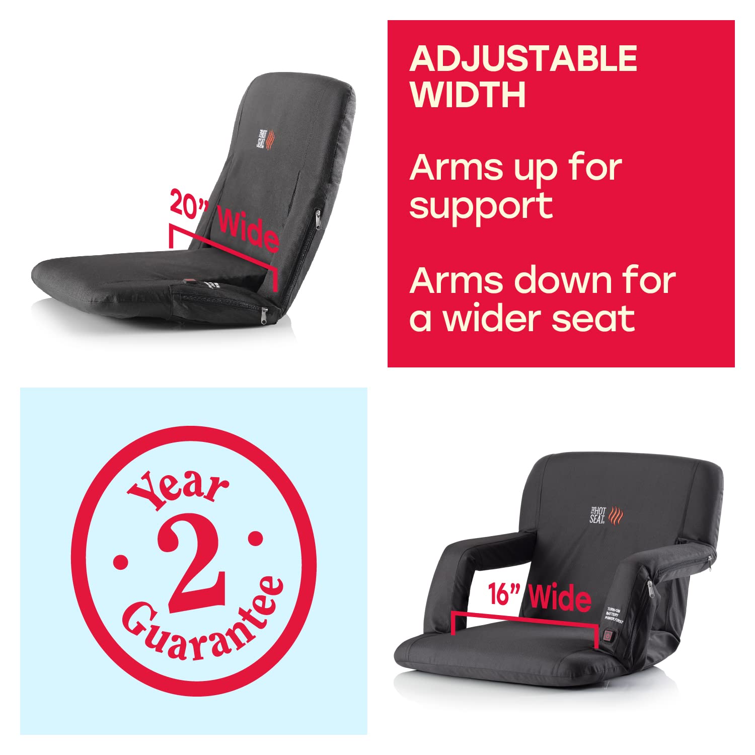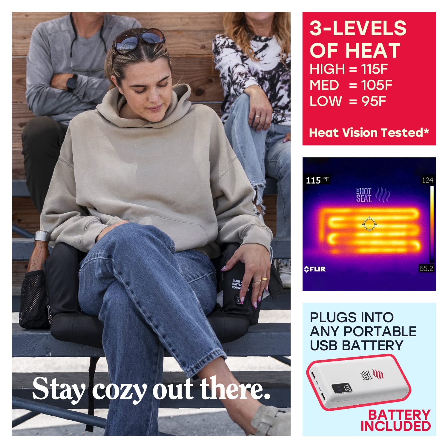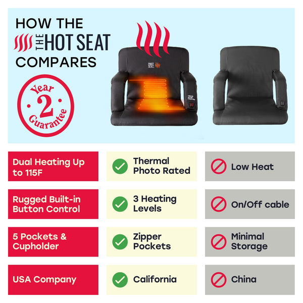 The Hot Stadium Seat features adjustable USB-powered heating technology (portable USB battery not included). Safely envelopes the body for relaxation while warming your muscles at any outdoor or indoor event. A simple push of a button can warm up your seat up to a toasty 110 degrees Fahrenheit. Works with ANY USB battery pack and can last over four hours. Simply plug the USB cable into the USB Port of your battery and feel the warmth! USB Heated Seat up to 115 Degrees, Comfortable High-Density Foam Seat, 4 Hidden Pockets for your valuables, Cup holder for your hot or cold drinks, and Backpack Carry Straps.