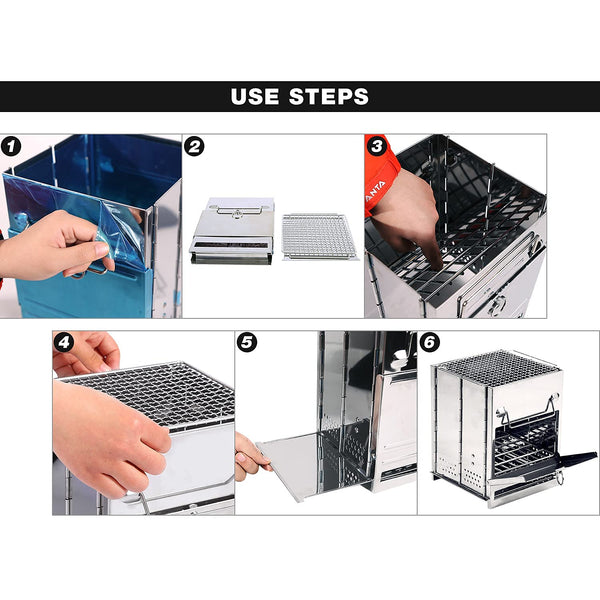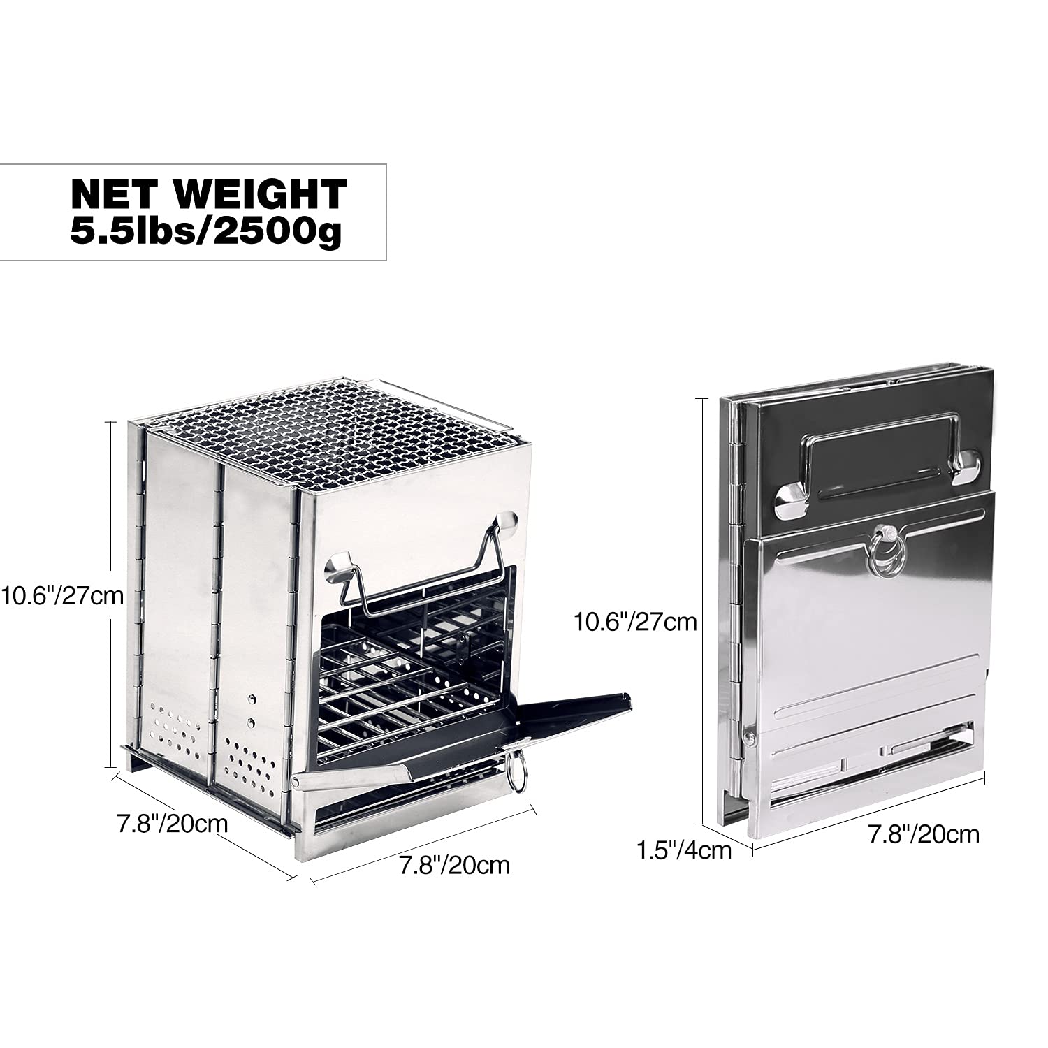 MATERIAL: After we listening to the customer 's adivce we will tear off the protective film when we finish the product. Please remove the residual protective film before use. Crafted with high quality stainless steel, this portable camping stove will steadily burn bright, whatever heavy weight or high heat comes its way | STABLE AND SAFE: Stainless Steel grid backing plate creates a stable cooking platform, the cuboid design makes the product more stable and provides a reliable support for the kitchen utensils | VARIOUS FUELS: The stove accept various fuels like leaves, twigs, you can get these easily in the nature and enjoy a real wilderness fun | FOLDABLE: Easily collapsible Unfold size: 10.6 ''x7.8 ''x7.8 '', fold size: 10.6 ''x7.8 ''x1.5 ''. Net weight: 5.5lbs/2500g. This camping stove comes with its own carry bag so you can sling it along and serve up a warm meal wherever you
