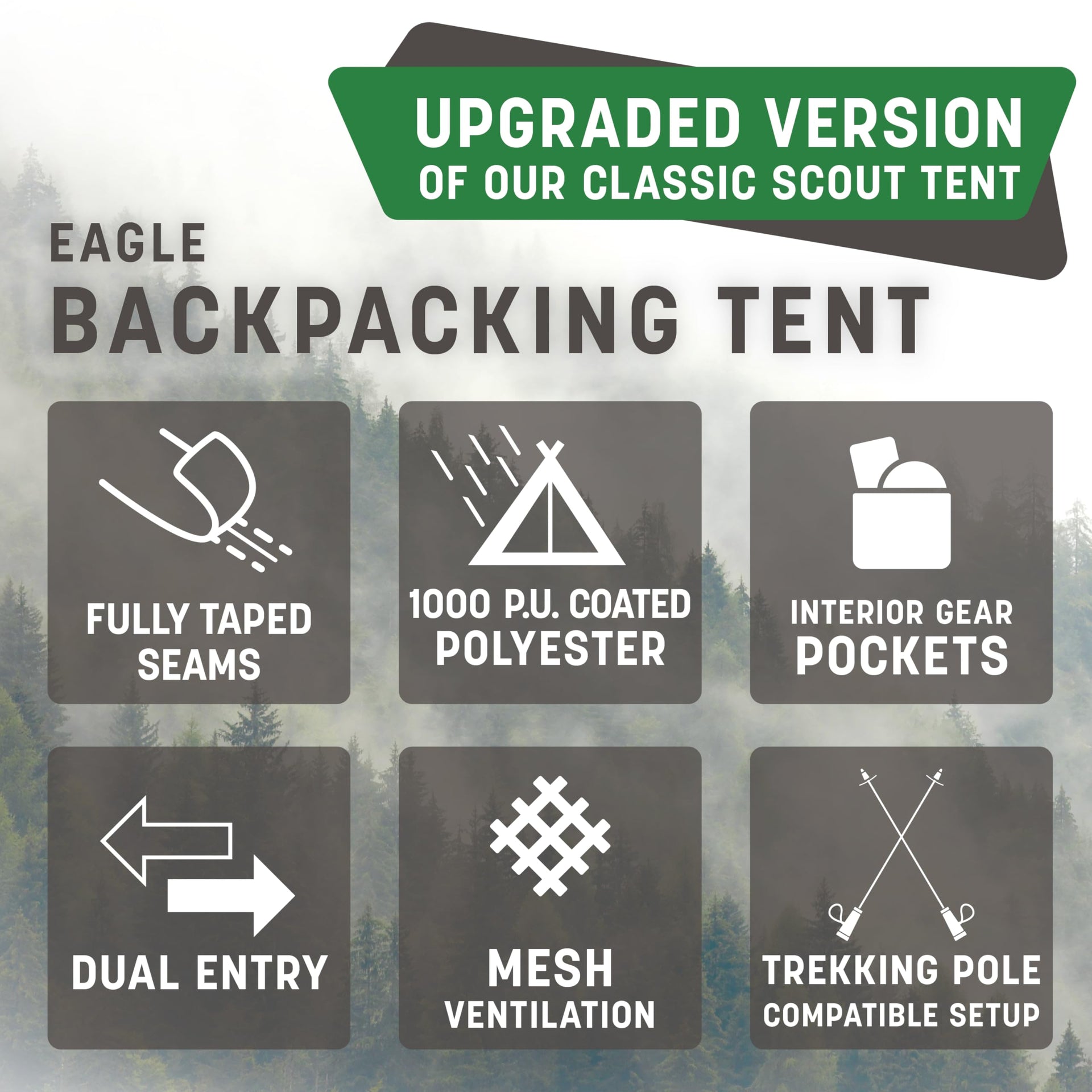 With the Stansport 2-person Eagle Backpacking Tent, youll sleep comfortable wherever you roam. This sturdy A-Frame tent is built around a classic scout troop tent design, and is constructed from 1,000mm P.U. coated polyester upper body with fully taped seams, and a polyester oxford bathtub style floor. Dual entry zippered mesh doors help provide plenty of ventilation. This shelter packs down small and assembles with ease. The tent is supported by two included steel poles, but can also be set up using a pair of trekking poles (not included). An upgraded take on our classic Scout A-Frame Tent.