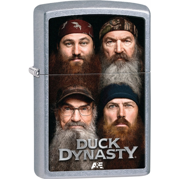 - Q: What is the design of the Zippo Pocket Lighter Duck Dynasty? A: The Zippo Pocket Lighter Duck Dynasty features four popular members of the Robertson family on a rugged street chrome finish.