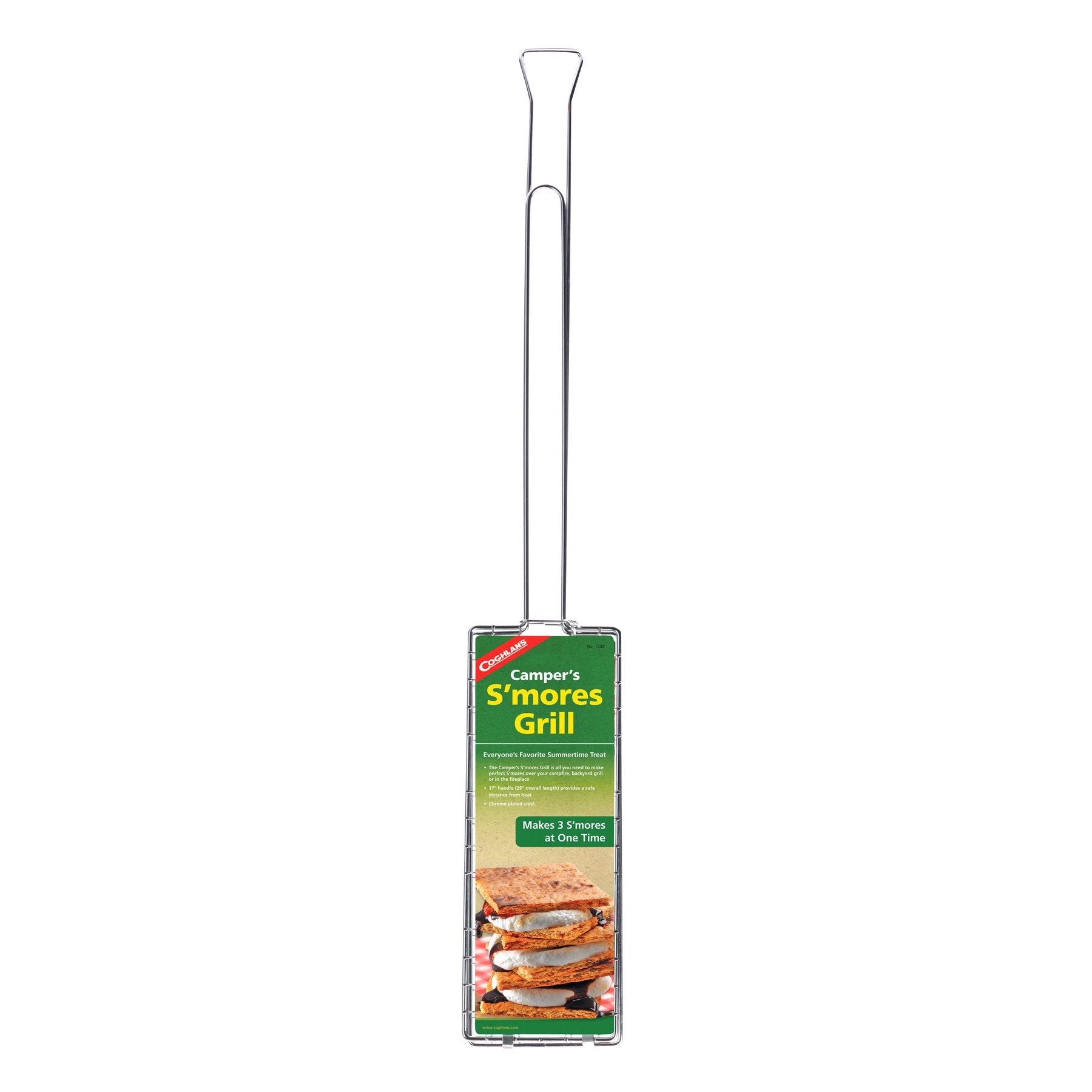 Enjoy a classic camp fire treat with the Coghlans Campers Smores Grill, a compact chrome-plated steel grill that makes three perfect S?ores at one time. Just put S?ores into one of the three cooking cavities and hold above the flames until the graham cracker is lightly toasted. The 17-inch handle provides a safe distance from the heat, while the sliding the lock ring keeps grill closed when cooking. It measures 29 inches overall. Coghlans makes the outdoors more comfortable and enjoyable with over 450 accessories for camping, hiking, fishing, and RVing -- from cooking gear to first aid kits, insect netting, firestarters, tent repair, and more.