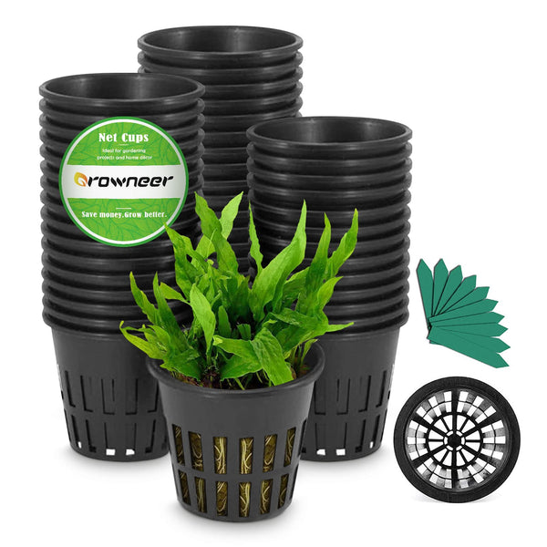 gROWNEER 50 Packs 3 Inch Net cups Slotted Mesh Wide Lip with 10Pcs Plant Labels Heavy Duty Filter Plant Net Pot Bucket Basket for Hydroponics garden containers