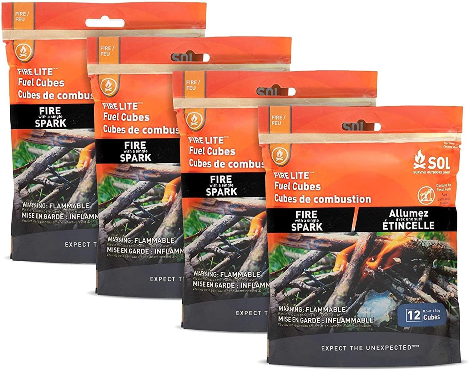 The essentials in cold weather survival is staying warm and the All-Weather Fire Cubes are a professional-grade fire starter that can come in handy in an emergency. Each cube is waterproof and windproof, able to be lit in even the worst weather. Each cube can burn for 8 minutes, or you can have multiple fires by dividing each cube into 8 smaller pieces thatll burn for 2-3 minutes. They can get up to 1300 degrees Fahrenheit, hot enough to boil 16 ounces of water in 10 minutes. You can keep yourself warm with a campfire and get yourself essential disinfected water with the fire cubes. The fire fuel burns completely smokeless and odorless and is nontoxic, helping to reduce environmental impact. They also do not include fossil fuels, to make your camping trip a little more forest friendly. They wont weigh down your survival gear, each cube weighs only 0.2 ounces making them compact and lightweight enough for any pack. Each set contains 4 packs of 12 cubes, for a total of 48 cubes. That is enough to stay warm and drink safely when cold weather and disaster strikes. Stay safe and stay warm with the S.O.L. All-Weather Fire Cubes.