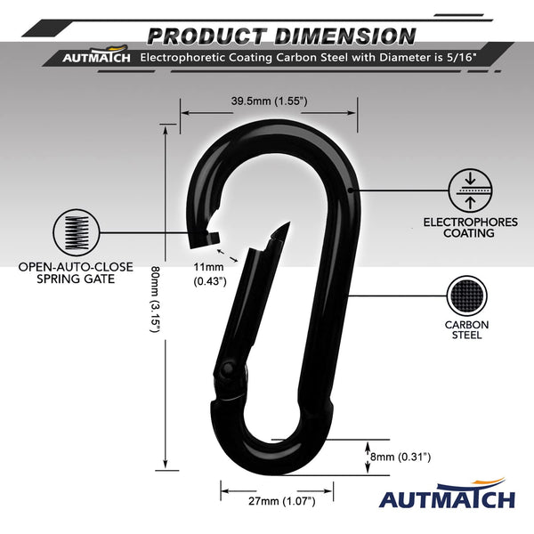 B> AUTMATcH Brand 304 Stainless Steel Snap Hooks Are Backed By Our 100% Satisfaction guarantee We Specialized In Designing And Manufacturing High Quality Indoor & Outdoor Products We Strive To Provide Our customers With Products And Services Which Meet And Even Exceed Their Expectations B>Brand: AUTMATcH B>Standard: M8 x 80mm B>Material: 304 Stainless Steel B>Total size: 80 x 395mm 315 L x 155 W B>Diameter: 031 (8mm) B>Total Weight: 86 Ounce Pack B>color: Silver Tone B>Maximum Static Load: 580lbs 260Kg B>Package: 4Pcs x Stainless Steel Snap Hook B>Applications: 1 Used To connect A chain, Wire Rope Quickdraw, Latchkey, Pet chain connection, Ropes connected Etc 2 Apply To Backpack, Key Ring, chains, Ropes, camping, Hiking, Fishing, Pet, Indoor Outdoor Equipment gear B>Were committed To creating great Products Backed By Friendly, Responsive Service To Delight Our Loyal customers Around The World