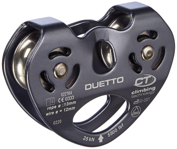 - Q: What is the weight of the Climbing Technology Duet Double Pulley? A: The Climbing Technology Duet Double Pulley weighs 290 g.
