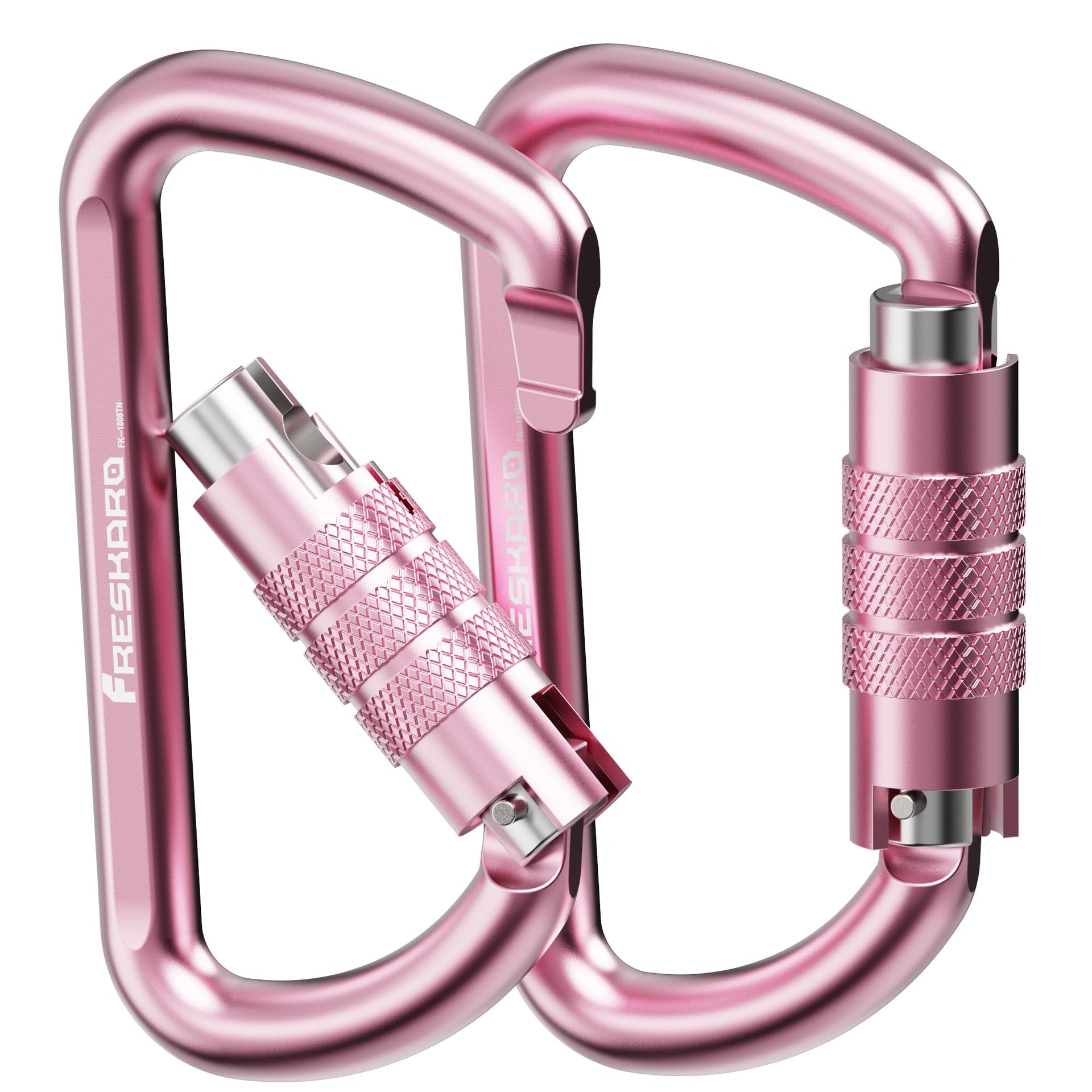 A new pink carabiner is specially designed for fashion concious customers, glossy and fashion ItAs widely used for bags, backpack, keys, hanging bird feeder in garden, outdoor camping to hang your tools, torches and bottles indoor hammock chair, outdoor hammocks etc With an auto lock, itAs easy and safety to use 7075 Aluminium is a special material with lightweight and strong characters This is a high-end small carabiner clips designed for high taste demand Specification colour: Pink Size: L: 319, W: 169, Opening gate: 059 Material: Aircraft aluminium7075 aluminium, rust free Tensile force: 12kN2698lbs Max (gravity Tensile Strength Testing) Package carabiners: 2pcs Note: This carabiner is not designed for climbing Why is this carabiner with twist lock 1Modern life, we know you are busy, save your time is save your life With the twist lock, it needs less than 1s to open or close the carabiner, 5times quicker than the screw lock 2Auto Locking, it is more safety to hang your keys or hammocks in case you forgot to screw up in a hurry with the traditional screw gate carabiners Why is this carabiner with D-shape design 1D-shape design is proved to hold the maximum strength at the same size 2With D-shape design, the carabiner basket could hold more things 3Opening gate is wider, and it allows bigger ropes through it
