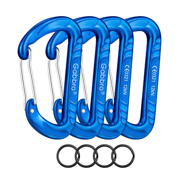 gABBRO is committed to provide you with high-quality climbing equipment and timely services to help you enjoy the happiness of outdoor activities while keep you safe and let your family feels relieved Safety and quality are our top priorityWhy choose gABBRO carabiner clips ----Made of 7075 aviation aluminum, upto 12kN strength quick draw carabiners ----Super lightweight of 34 oz----Economical 4 packs, enough for daily using----Premiere blue paint coated tactical carabiner ----4 key rings as bonus Specification: Model: Wiregate carabinerMaterial: Ultra lightweight 7075 Aircraft AluminumMaximum Load: 12 KN 2697 lbsQuantity: 4 PcsWeight: 34 ozcolor: BlueApplication: Hammock, swing, dog Leashes, keychain, hiking& climbing gear, quick draw, water bottle,backpackWhat do you get4* gABBRO Wiregate carabiner4* Black Key Rings1* Stop card