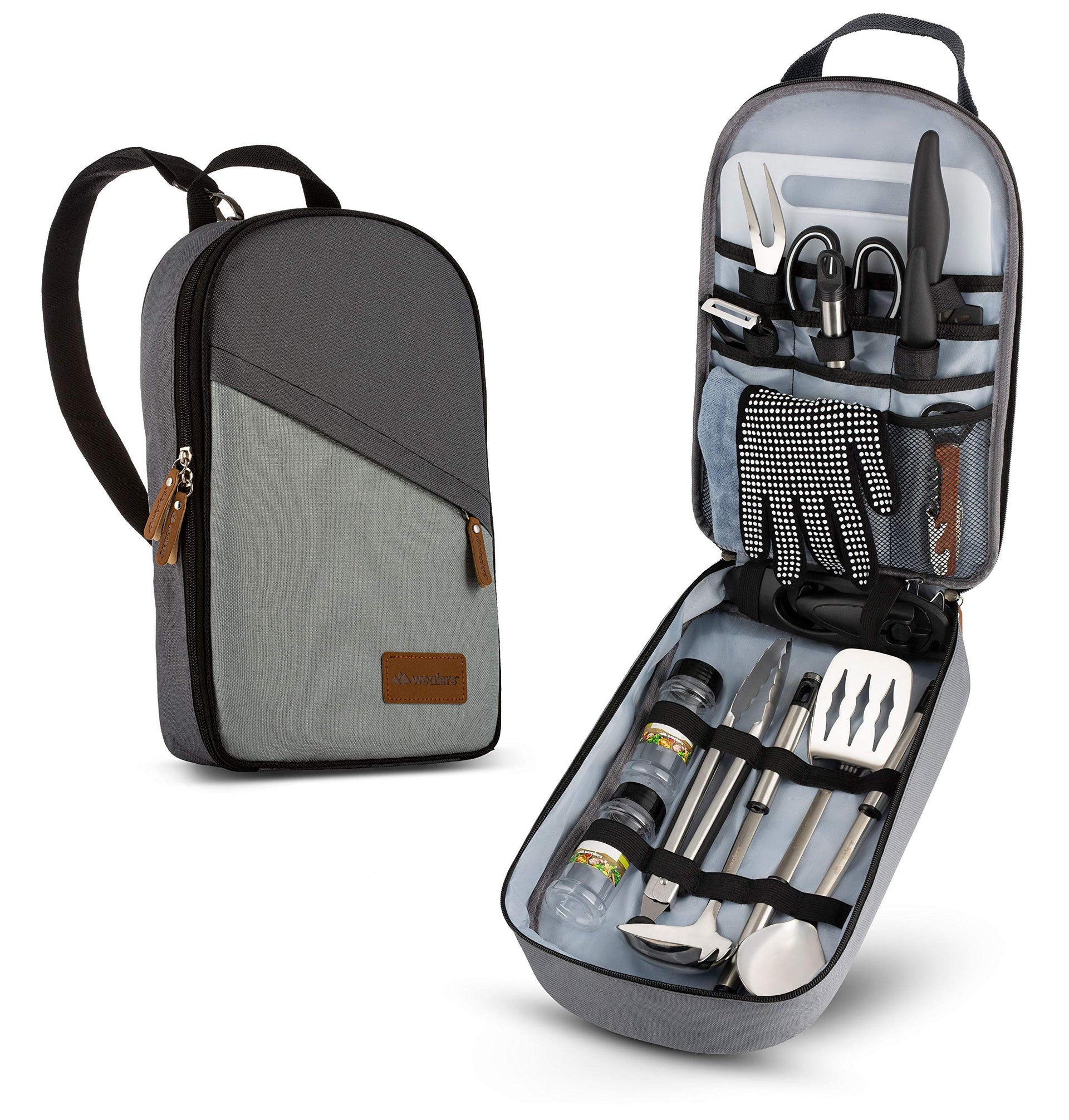 - Q: What is included in the 17 Pieces Camp Kitchen Cooking Utensil Set? A: The set includes various cooking utensils organized in a portable case, designed for easy access and protection during travel.