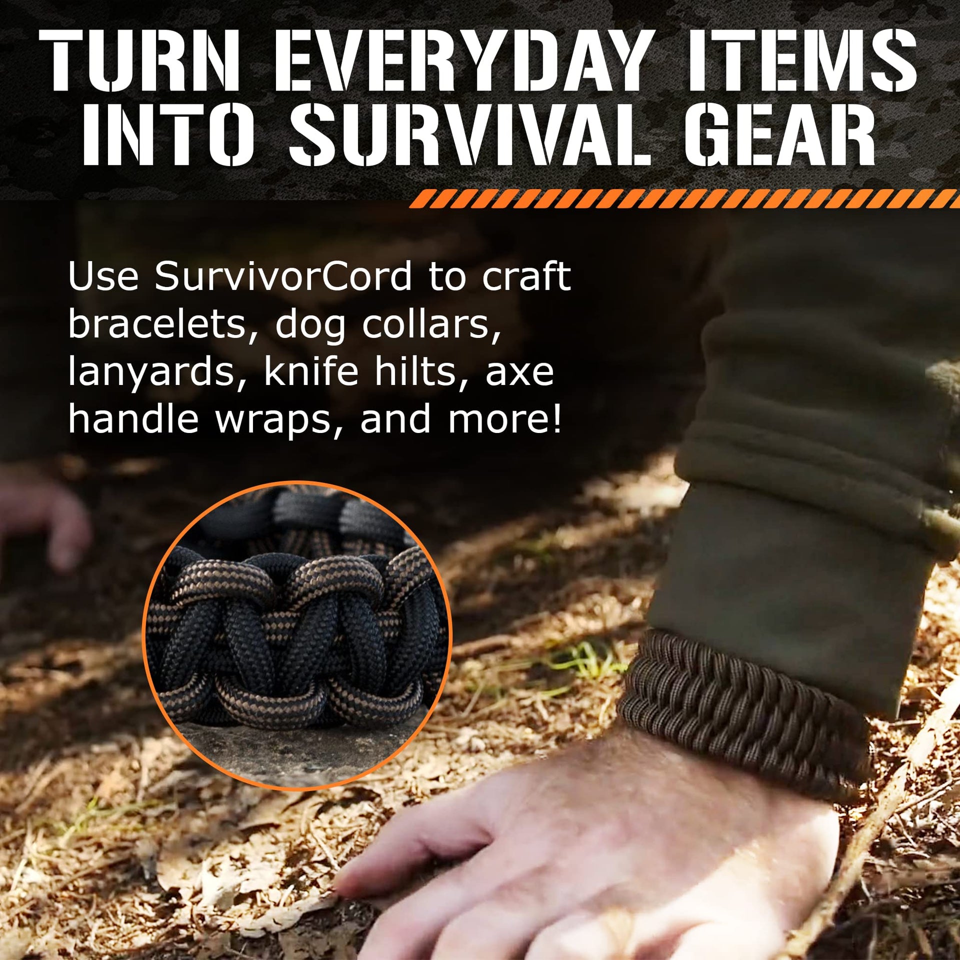 When you need to be prepared for anything, youll need equipment that can handle everything. Cordage can be a lifesaver in the wilderness and during emergencies, but not all paracords are made equal. Born from an 18-month intensive design collaboration with U.S. Special Forces in Afghanistan, TITAN Survivals SurvivorCord is a top-tier 550 paracord that is hard to beat. Our famous MIL-STYLE 550 paracord with a 7-strand nylon core is one of the strongest, most durable cords you can find. But you wont just get an impressive 620-LB. tensile strength, youll also find 3x potentially lifesaving survival strands integrated into the core of the paracord: A 25-lb, high-strength, mono-filament fishing line that can be your lifeline in the wilderness. It can also be melted to patch holes or used to bind tools together. A multi-purpose, 30 AWG, conductive utility wire that can be used for small animal snares, camp-fire cooking, and any other survival uses you can think of. A wax-impregnated, jute fiber, waterproof fire starter thatll make sure you can get a fire going no matter the weather conditions. Founded, owned, and operated by a U.S. Combat Veteran, TITAN Survival knows what you need in a heavy-duty paracord. We designed SurvivorCord to surpass military standards, thats why its the first choice for parachute cord by wilderness survivor enthusiasts, survival experts, and military units all over the world. When it comes to durability, strength, and survival, weve thought of everything and covered all the bases. So dont settle for anything less, get TITAN Survivals patented SurvivorCord today! Product Specifications: Length Variations: 100-Foot or 500-Foot Spool; Diameter: 4.5 - 5.0 mm; Fishing Line Strength: 25 lbs.; Utility Wire Metal: Brass; Utility Wire Gauge: 30 AWG; Utility; Wire Strength: 8 lbs.; Waxed Jute Diameter: 2 mm