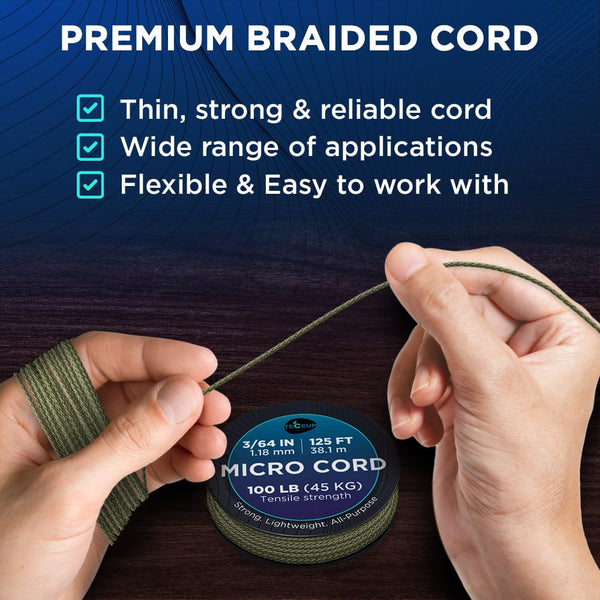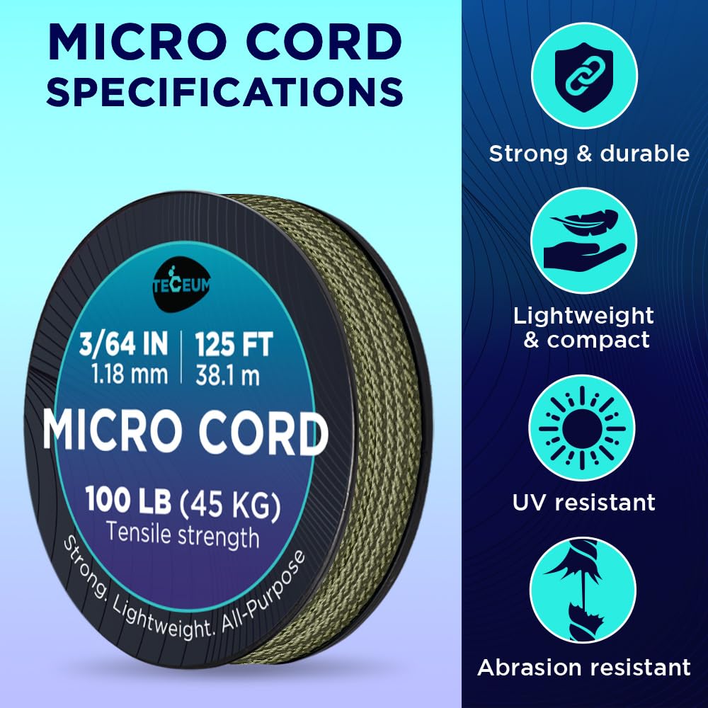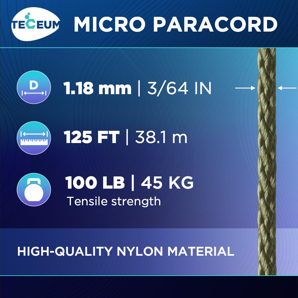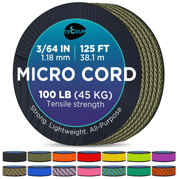 Teceum Micro Paracord - Army Green - 1.18 Mm X 125 Ft - Micro Utility Cord - Thin Braided Paracord Rope Nylon Polyester - Wind C