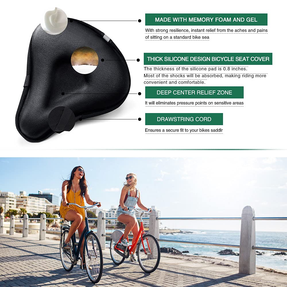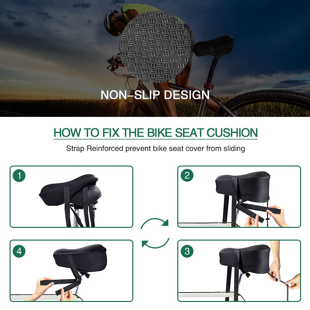 -Product Name: Gel Bike Seat Cushion Cover. -Order contains: Bicycle seat cushion cover, waterproof & dustproof cover -Size: 10.5x9.5x2 (L*W*H) -Material: High-density memory foam, gel, anti-skid leather and Lycra fabric. Compact Material ANZOME comfortable bike seat cushion is padded by thicken and widened high-density memory foam, and the bike saddle surface is non-slip wear-resistant texture Lycra fabric. The cushion is durable, comfortable, good elastic and very soft, better protect your buttocks! Say goodbye to the pain and enjoy the fun of riding now. Easy to install and remove Customer Satisfaction All gel bicycle seat cushion cover are comprehensively and strictly tested before selling. If you have any questions, please feel free to contact us. We will provide you with a satisfactory solution. Keep one for yourself and recommend it to your friends, unlock more exciting adventures.