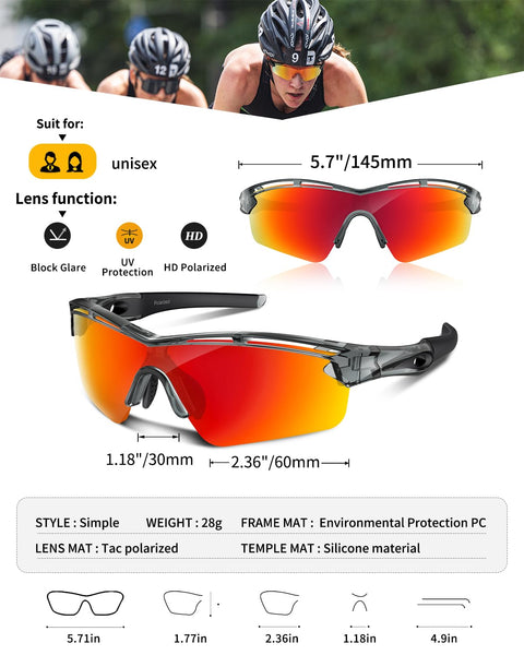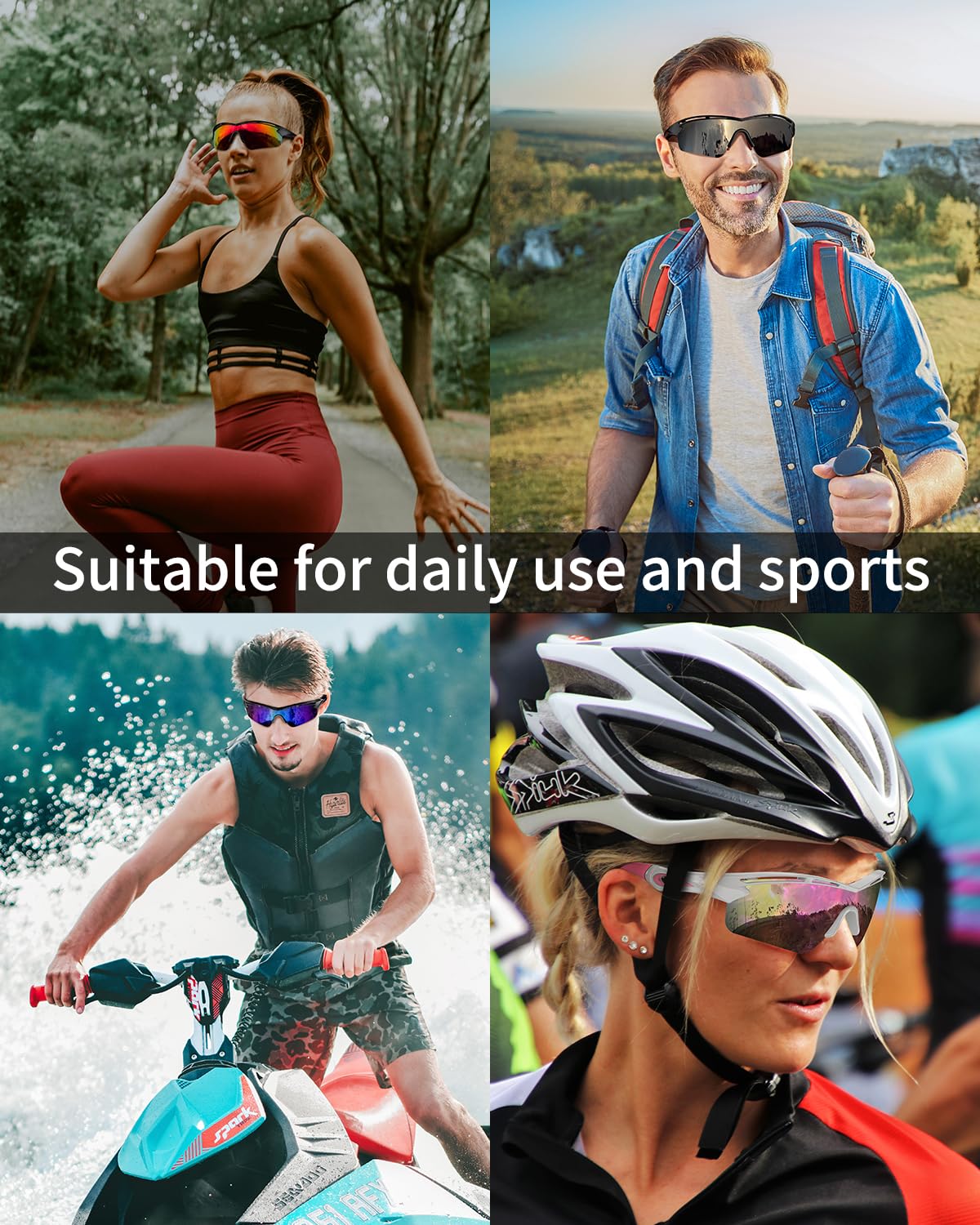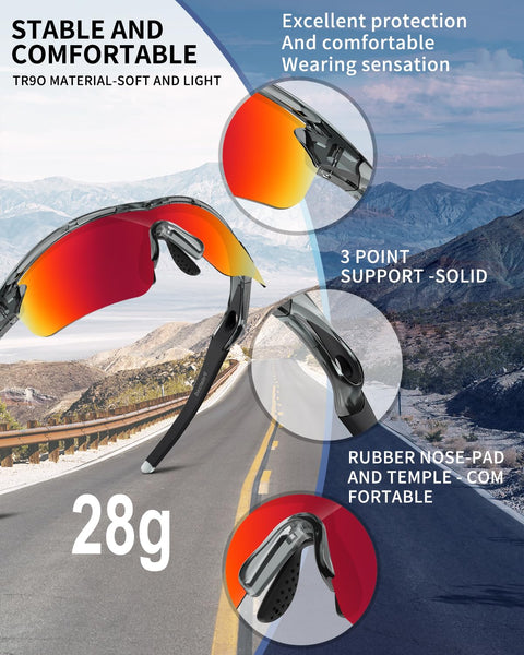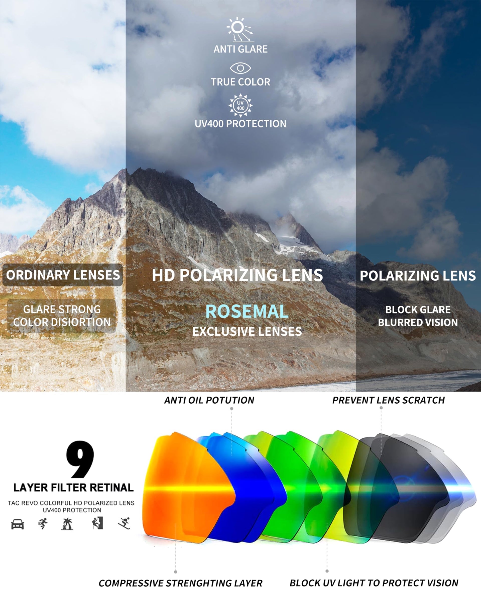 PACKAGE INCLUDES - 1 * HD Polarized Sunglasses/ 1 * Sunglasses Lanyard/ 1 * Sunglasses cloth/ 1 * Polarized Test Card/ 1 * Small Sunglasses Pouch/ 1 * Oval Hard Case/ 1 * Gift Box | TAC POLARIZED LENS - 100% UV 400 protection coating, blocks 100% harmful UVA, UVB&UVC, and blue light. Restore true color, eliminate glare and reflected light, and make the scenery more clear and real. Since light with a wavelength below 400 nanometers is in the ultraviolet light range which is harmful to the eyes, these sunglasses will give complete UV protection for people to protect their eyes perfectly. | Unique Comfortable Design- The metal spring hinge is special and extremely flexible. Solid 3-point support with slip-resistant rubber nose pad and leg, fits the face perfectly. TR90 material frame is soft, durable, unbreakable, highly flexible, and ultra-light. | CLEAR, SUPERLIGHT, STYLISH, AND DURABLE - Lightweight design is ideal for motorcycle and cycling bicycles, driving, fishing, walking racing, climbing, hiking, or other outdoor activities. Fashion and stylish design, with rich color combinations of frames and 1.0 thickness lens. Polycarbonate lenses and frames are impact-resistant, scratch-resistant, flexible, durable, and unbreakable. | LIFETIME WARRANTY - Frames and lenses are unbreakable for no risk purchasing. If something wrong with our sports sunglasses, contact Rosemal eyewear experts without hesitation to solve the problem until satisfaction.