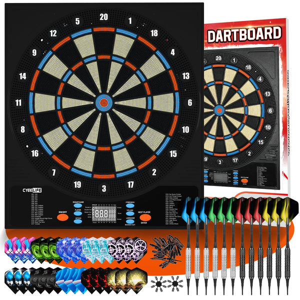 - Q: What is included in the CyeeLife Electronic Dartboard package? A: The CyeeLife Electronic Dartboard package includes the dartboard itself, soft darts, an adapter for power, and instructions for use.