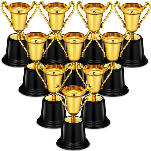 Award Winning Trophies Each Bedwina pack of trophies in bulk includes 12 - 5 Inch tall plastic trophy cups with a beautiful glossy gold finish. With these gold award trophy cups the possibilities are endless. The cups are large enough to fit a few pieces of candy inside or rest a golf ball on-top and the base is large enough for a homemade nameplate. Spectacular-Looking Trophies and AwardsWith our golden trophies everyone is a winner! Challenge everyone to have a great time at your party and give them the recognition and acknowledgement they deserve with these spectacular-looking trophies and awards. High Quality - Sturdy Durable Plastic These trophies for kids are made from high quality non-toxic plastic and individually wrapped. Each cup is secured to its base is well packaged and individually wrapped with care so they arrive safely. Recommended for ages 3 and up KEY FEATURES: Pack of 12 Gold Trophies 5-Inches Tall Great for Party Favors, Awards, Games, Achievements Metallic Gold Cups Black Bases Made from Non-Toxic Plastic High Quality Individually Wrapped Recommended Ages 3+ Click ''Add to Cart'' to order your mini trophies 12 pack Today!
