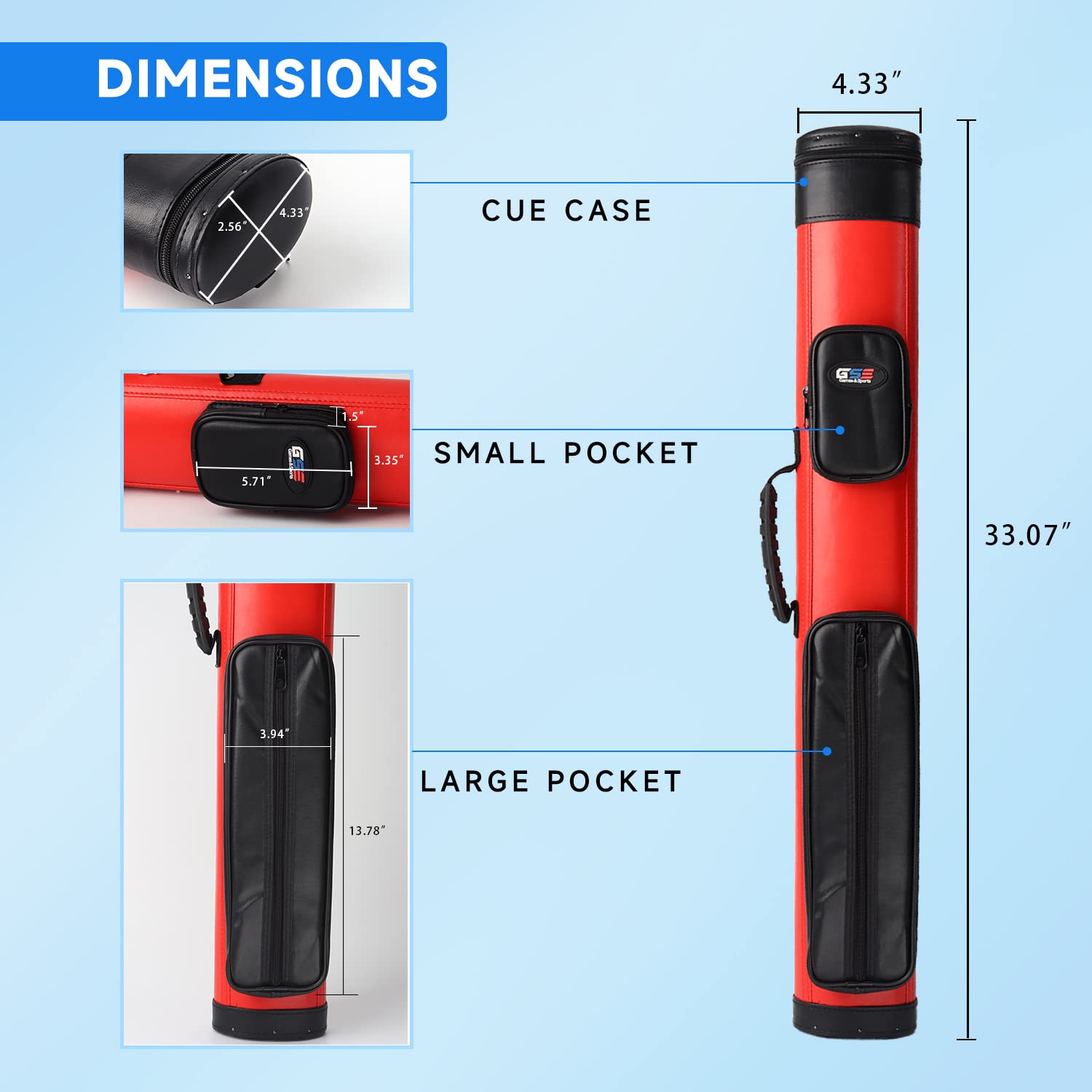 The gSE 2x2 black billiard cue case is designed with a leatherette covering, a large pocket, a small pocket, an adjustable shoulder strap for easy carrying, and a soft handle held comfortably, with an oval cross section, quality and durable The inside of the case is separated into 4 independent spaces to hold 2 butts and 2 shafts, and the soft interior cushions the cue sticks if it drops Measuring 33L x 433W x 256H, the pool stick case is perfect for all two 2-piece cues measuring 58 inches or less, an indispensable billiard accessory