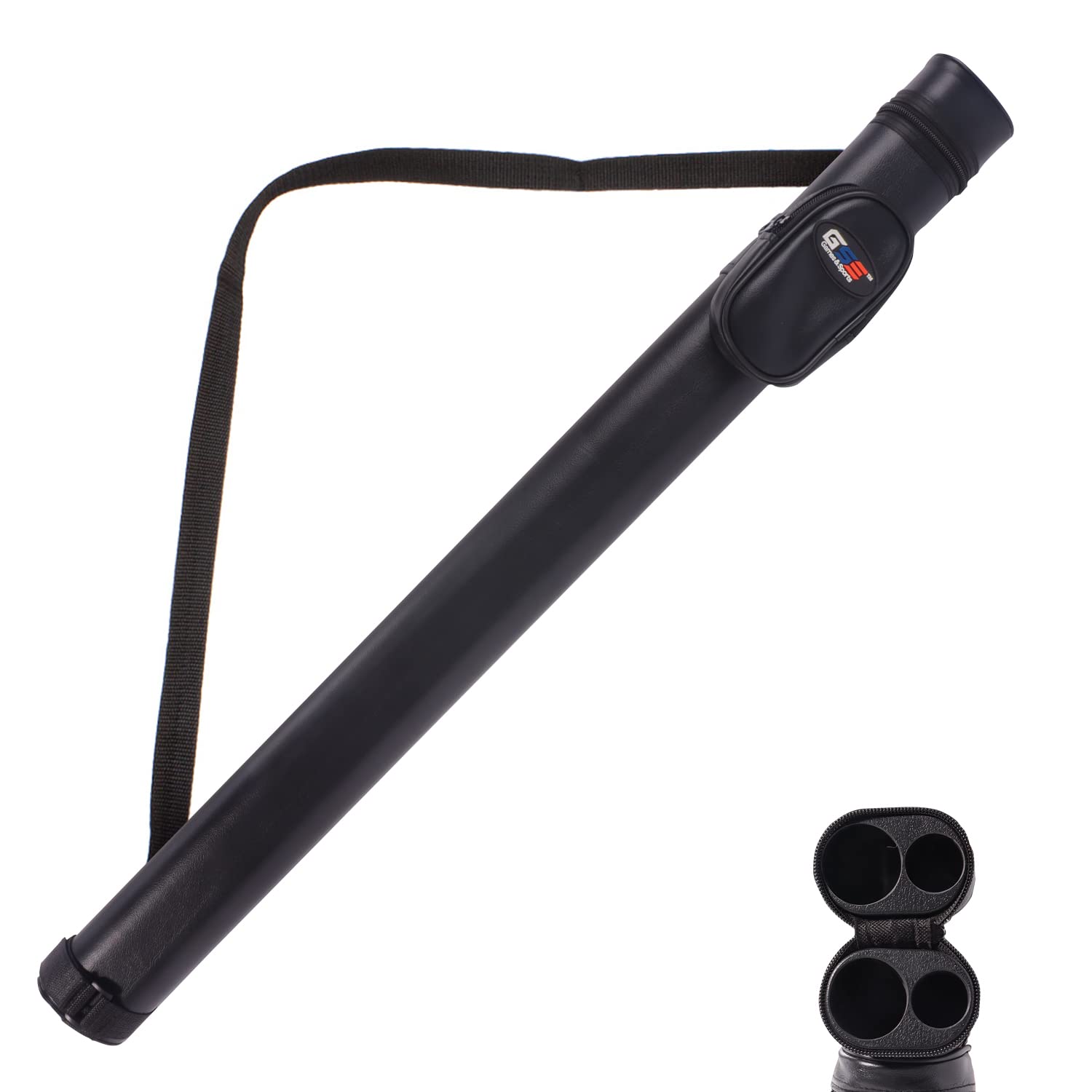 The gSE 1x1 black deluxe billiard cue case is designed with a hard leatherette covering from bumps and scratches, an adjustable shoulder strap for easy carrying, a slid-able zipper pocket, and an oval cross section, quality and durable The inside of case is separated into 2 independent spaces to hold 1 butt and 1 shaft, and the soft felt-lined bottom cushions the pool cue if it drops Measuring 3386L x 276W x 177H, the pool stick case is perfect for all 2-piece cues measuring 58 inches or less, an indispensable billiard accessory