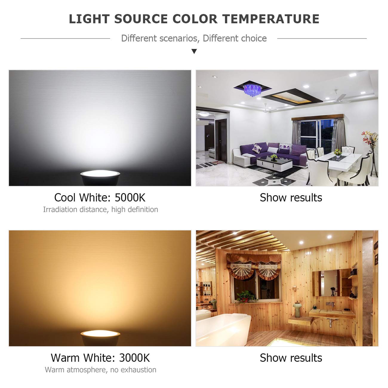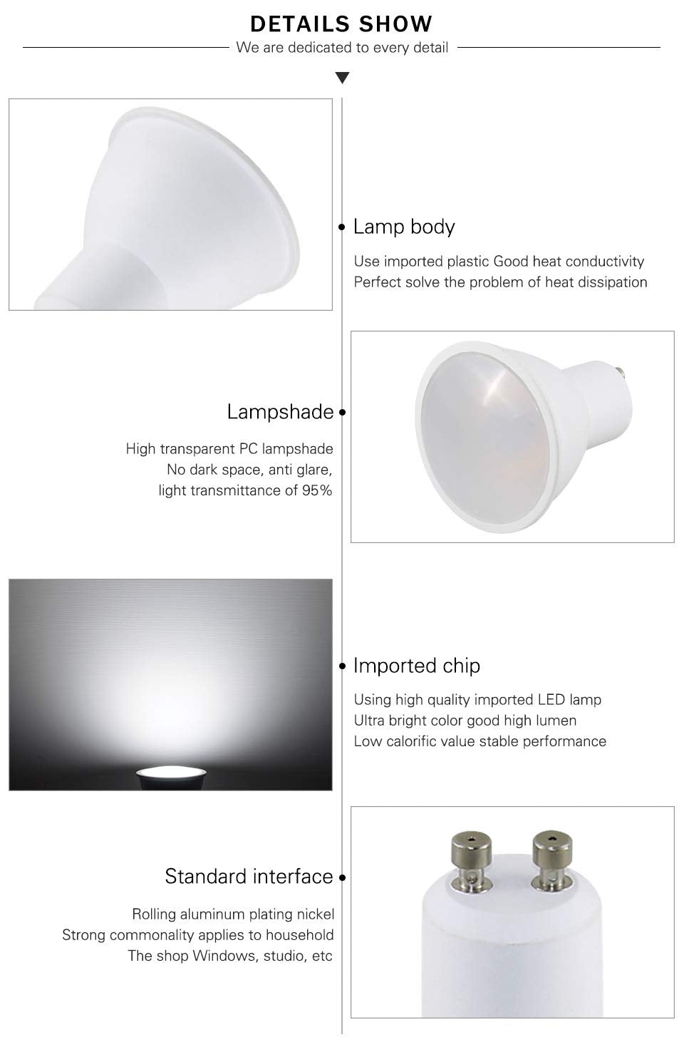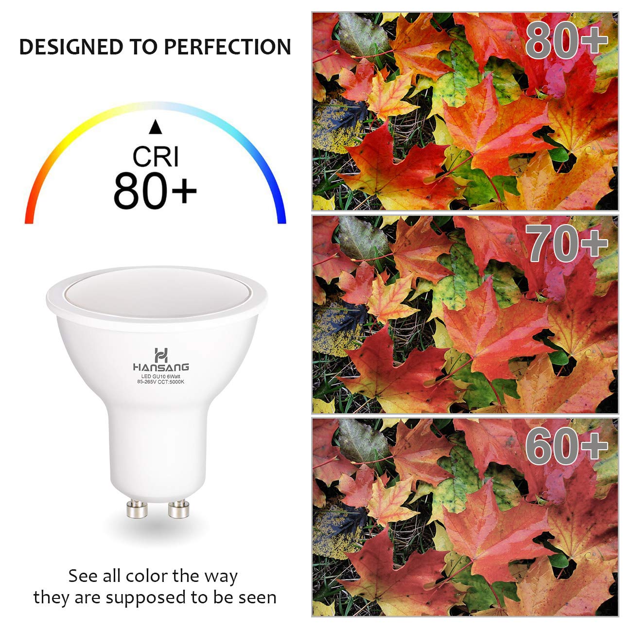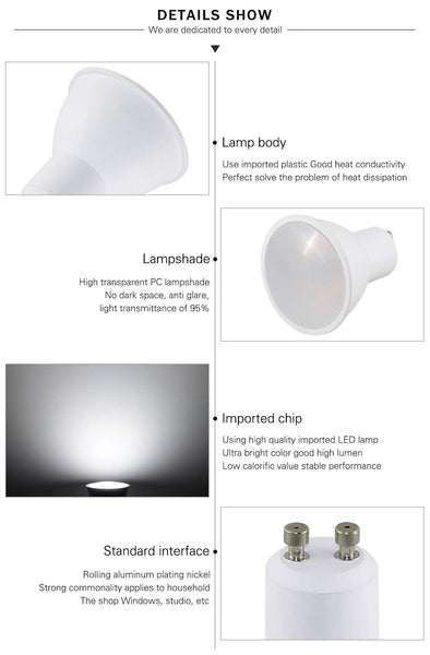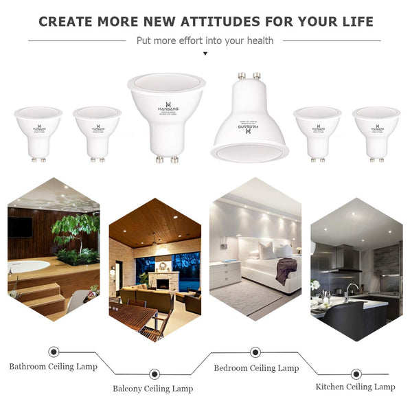 Specification:nbsp - Brand: Hansangnbsp - Base: gU10 - Beam angle: 120degree - Voltage: Ac 85-265Volt - Wattage:6W(replace 50W halogen bulb)nbsp - Brightness Lumen: 550LMnbsp - Light Source:LED SMD2835 - color: Daylight white 5000Knbsp - Shape:MR16gU10 Shape - Material: Aluminumplasticnbsp - cRI: Ragt80 - Dimmable: No - 6 pcs in one box - Item size:F196x 216 - Lifespan: 30,000 hr
