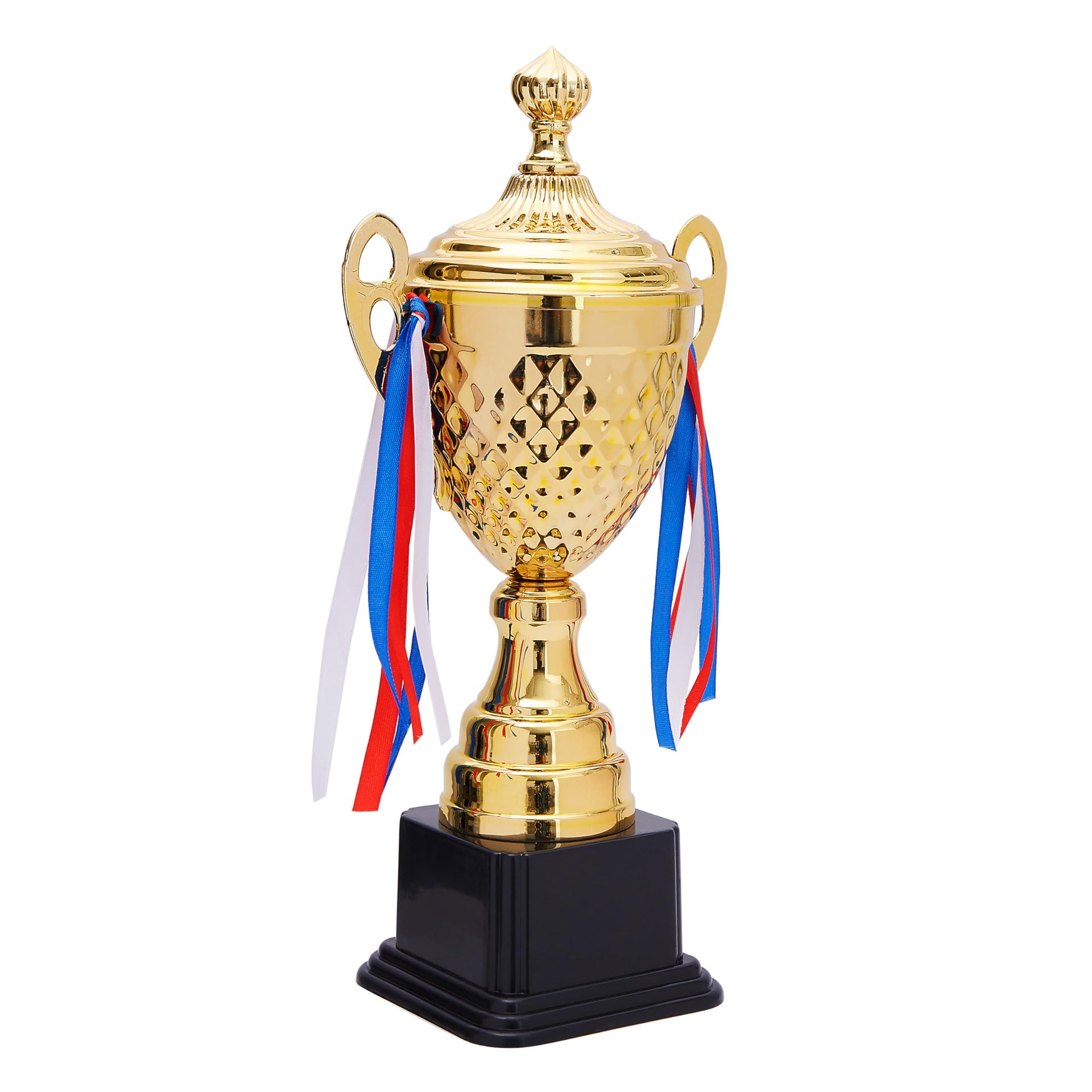 Our trophy award is the perfect reward for the high achiever in your life. This general-use gold trophy can serve as a golf trophy, soccer trophy, basketball trophy, fantasy football trophy, or for any type of event or competition. Teachers can use them to award at spelling bees or as a fun reward for the highest score on a test. This big trophy is made of durable iron with gold-tone plating on a plastic base. This giant trophy measures 15.2 x 7.5 x 3.7 and is adorned with a red, white, and blue bow tie knot ribbon that adds to the golden splendor.