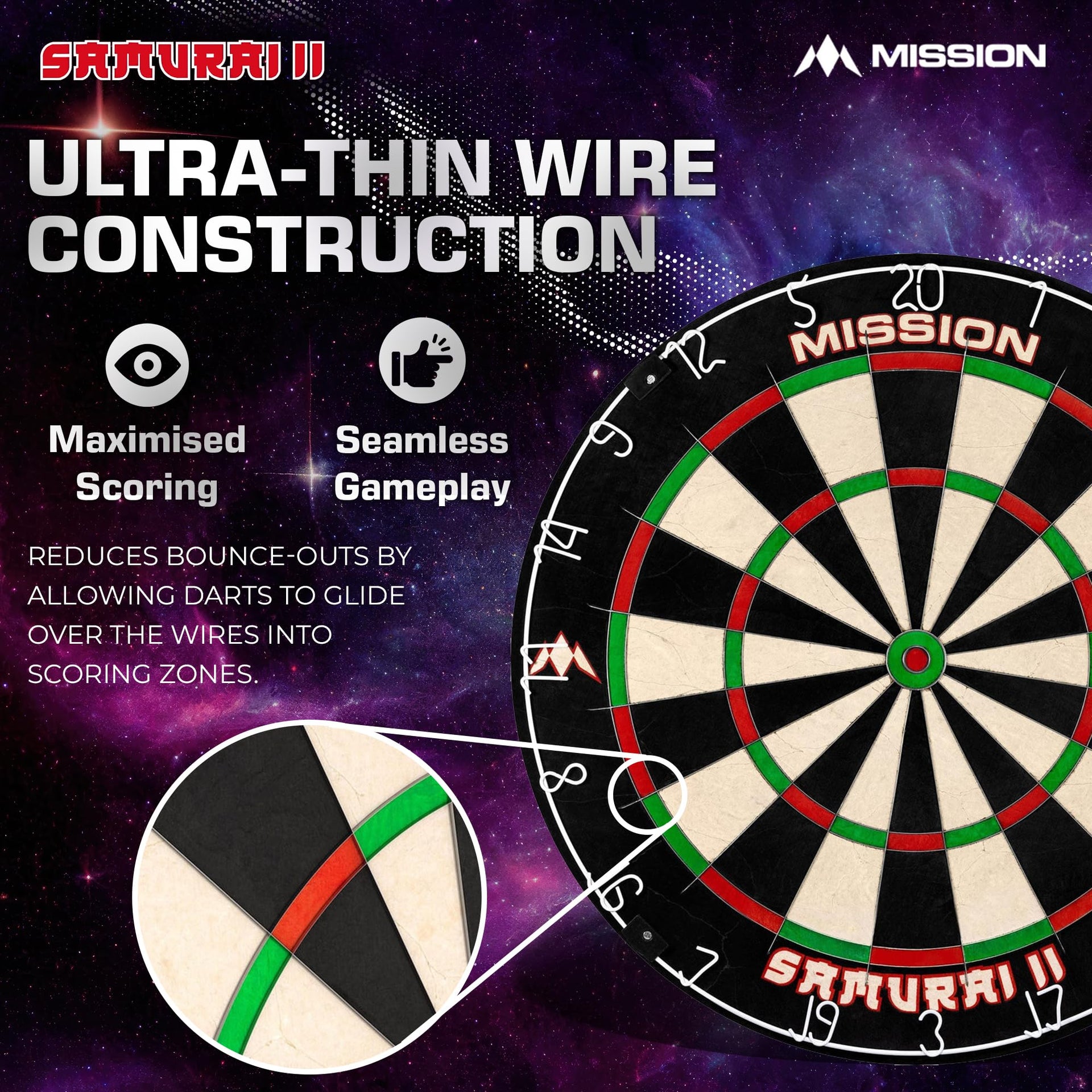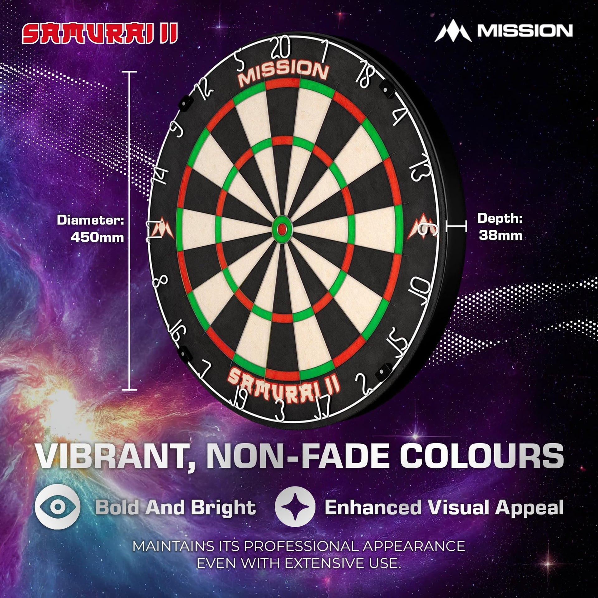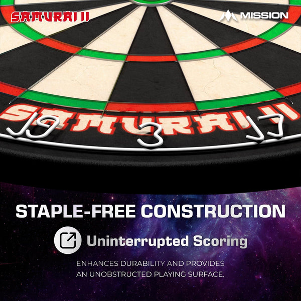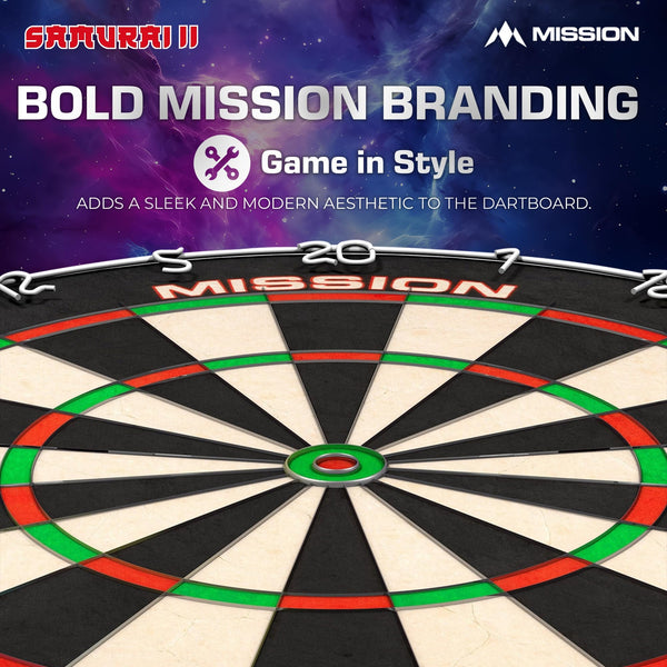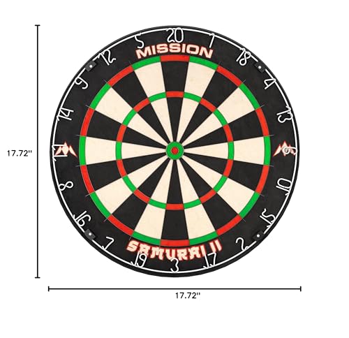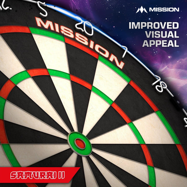 The Mission Samurai II is a competition standard top quality dartboard with ultra thin wire construction. The sharp angle of the wires enables darts to glance over them and into the scoring areas, resulting in less bounce outs and damage to the darts. The Mission Samurai dartboard, manufactured from high quality African sisal. The board features a staple free construction and vibrant non fade colours. Dartboard Specification Material: African Sisal Diameter: 450mm Depth: 38mm