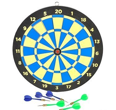 Product Description15 wooden dart gameIncludes 6 sharpened dartsColorful displayDouble sided for more games1 set per unit12 units per caseAges 12+From the Manufacturer15'' wooden dart bristle board with real darts. Heavy duty steel rim 20 point English-style board. Wire divider.