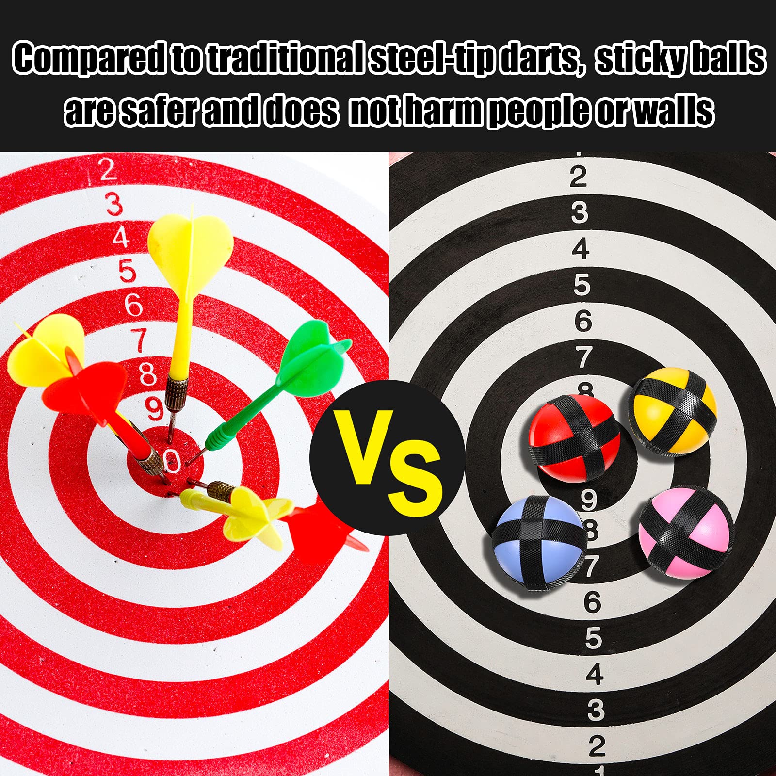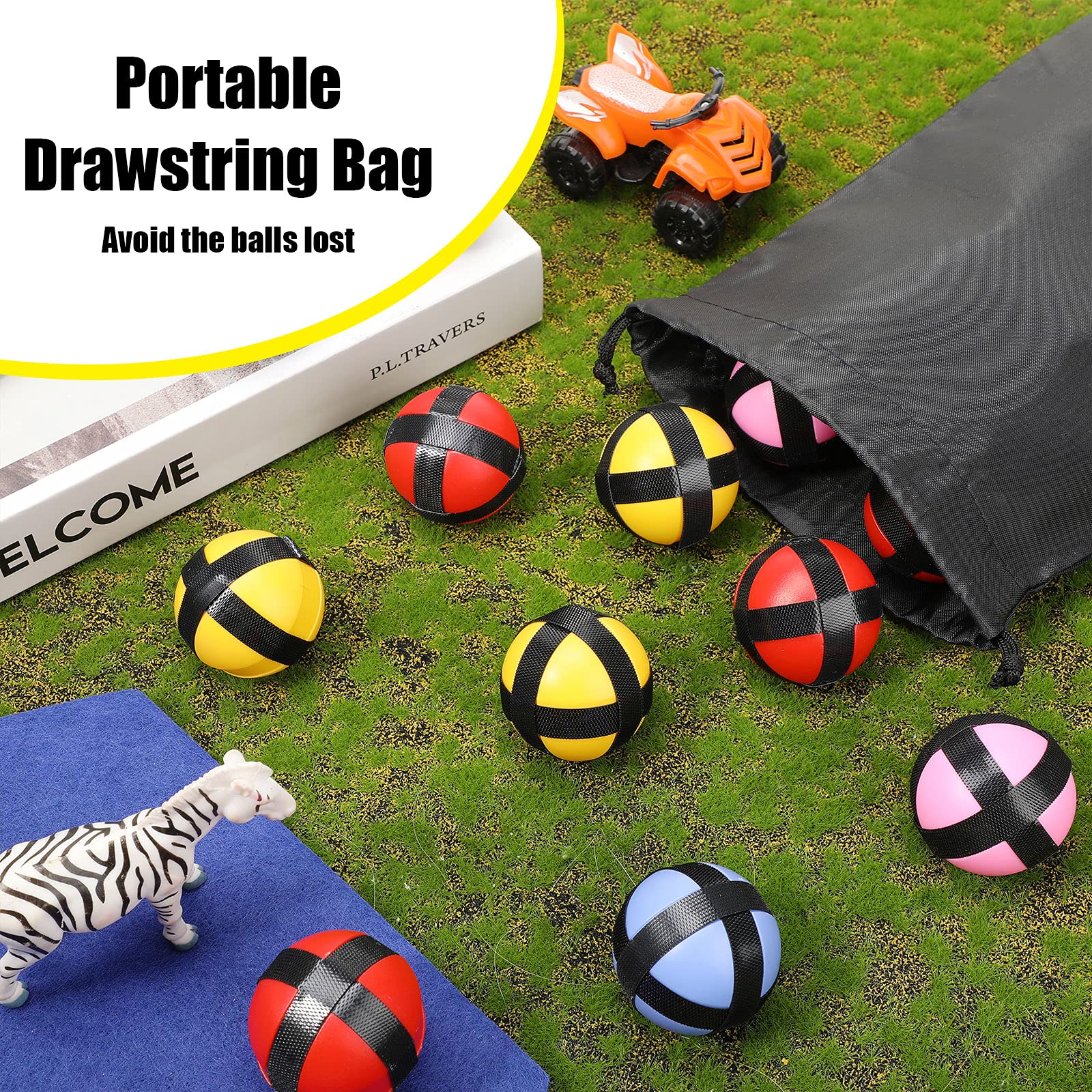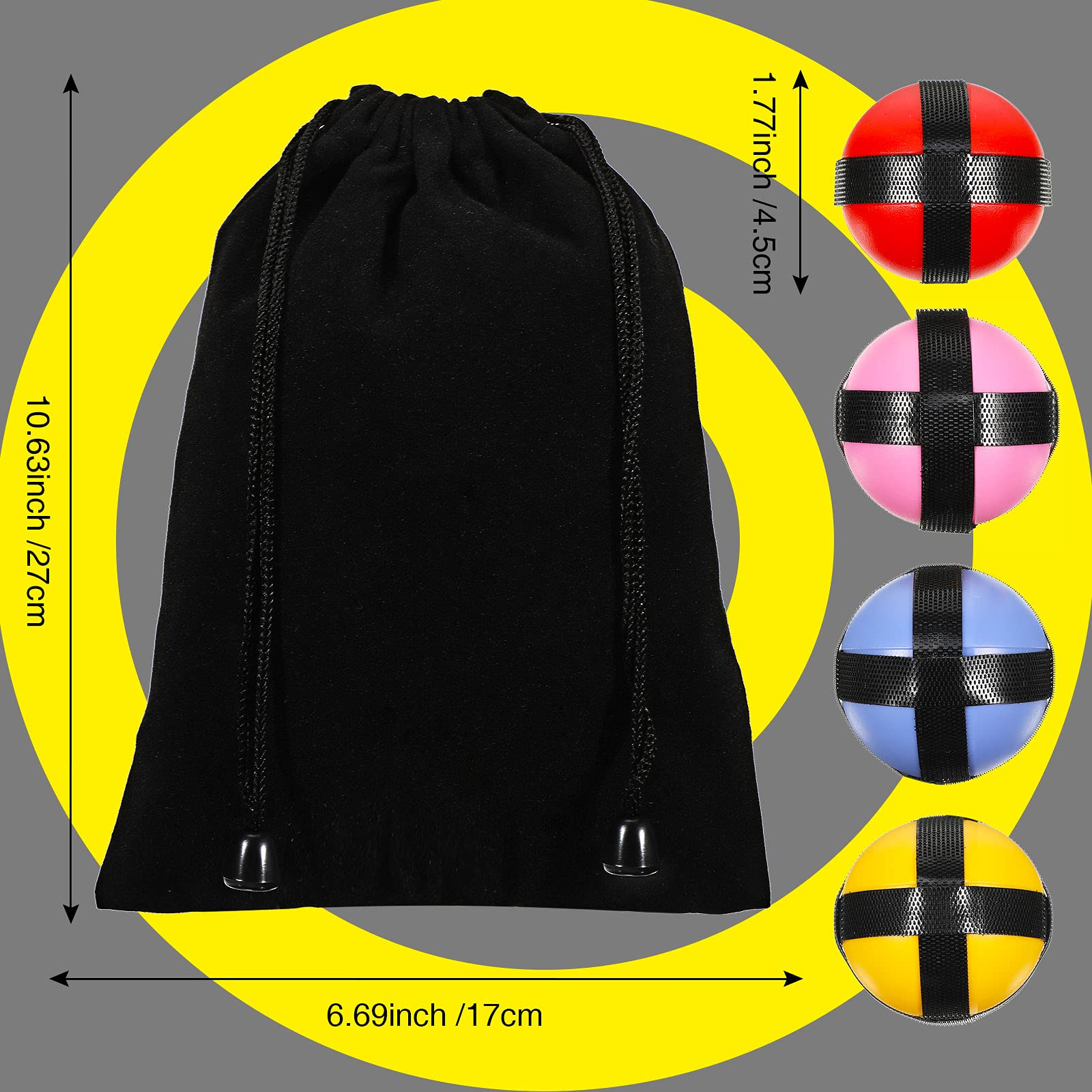 Features: Sticky and durable: Made of quality fabrics, these 20 sports ball toys are equipped with strong stickiness. When the sticky ball hits the fabric dart board, it will not easily fall off. Educational and helpful: This is a fun family toy to help youngsters keep away from computers and mobile games, improving kidsmath skills and logical thinking in a simple scoring game, promoting playerssocial skills and observation ability, enhancing family relationships. Specifications: Material: plastic Colors: red, yellow, blue, pink Size: Ball: about 1.77 inches/ 4.5 cm in diameter Bag: about 6.69 x 10.63 inches/ 17 x 27 cm Package includes: 20 x Sticky dart balls (5 red, 5 blue, 5 yellow, 5 pink) 1 x Storage bag Warm notes: Because of manual measurement, there might be slight errors in size, please understand. The colors may exist slight differences due to different screens.