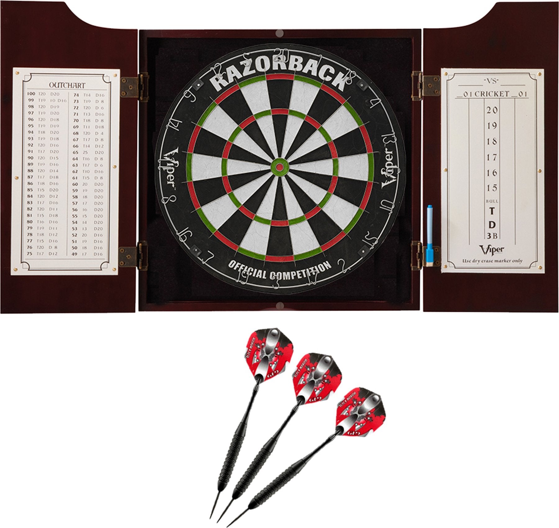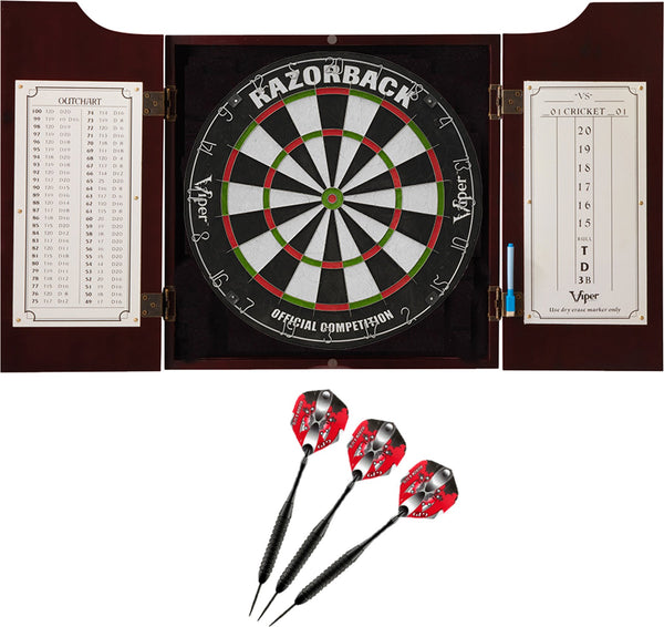 Everything you need to optimize your darting experience is now available in a convenient, comprehensive bundle. Each bundled set contains a premium dartboard cabinet and a sisal/bristle staple-free bullseye dartboard. Each cabinet includes a dry erase scoreboard, out-chart board, dry erase marker and mounting hardware. The Viper Hudson dartboard cabinet features a mahogany finish and is lined with black felt. Crafted with solid pine, box joints and bronze hinges, this cabinets quality construction provides lasting durability and complements the look of any room. Its fitted with 2 compact door stoppers which help protect the dartboard and cabinet from a door slamming shut. Open dimensions: 41.5'' L x 21.25'' W x 3.5'' D; closed dimensions: 23.25'' L x 21.25'' W x 3.5 D. Measuring 18'' in diameter, which is official tournament size, each dartboard features a staple-free bullseye which greatly reduces bounce outs. Its constructed from self-healing sisal/bristle fibers compressed together, providing unsurpassed durability. A movable number ring further extends the dartboards life. All bundles (with the exception of the standard bundle) include 1 set of Viper Black Mariah 22 gram steel tip darts. They are designed with black coated brass barrels that deliver exceptional balance and styling. Strategically placed knurling and grooves provide excellent gripping points, enhancing your control. Each dart features an aluminum shaft equipped with a locking hole which enables you to further tighten the connection to the barrel, improving stability. The Elite bundle includes a Viper laser dart throw line marker. The bright and energy efficient lighting of the laser allows it to be seen even in intense daylight. The adjustable laser throw line provides an alternative to traditional adhesive floor markers. Once its mounted, simply tighten the 2 screws on either side of the laser to ensure it stays in place, even if it is bumped.