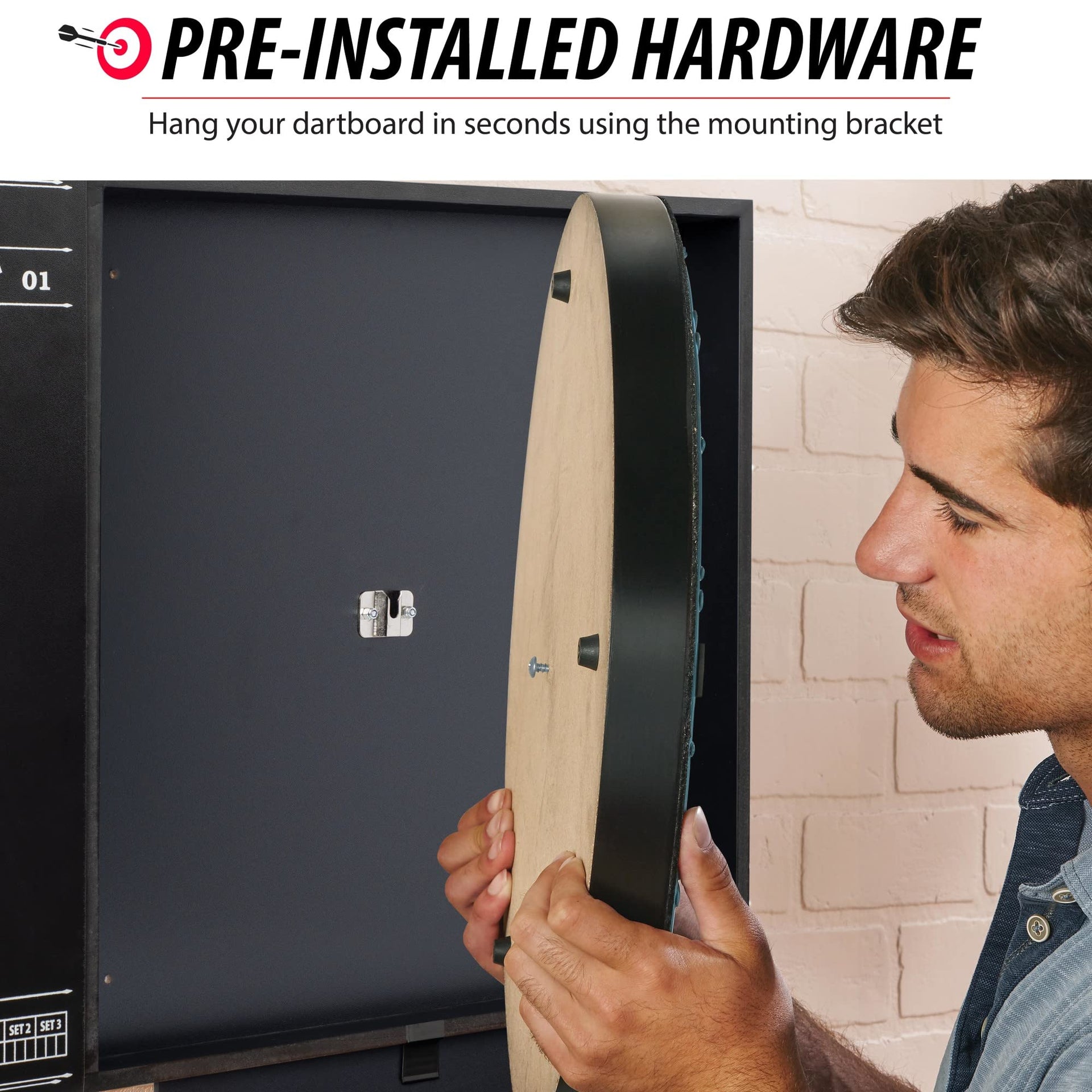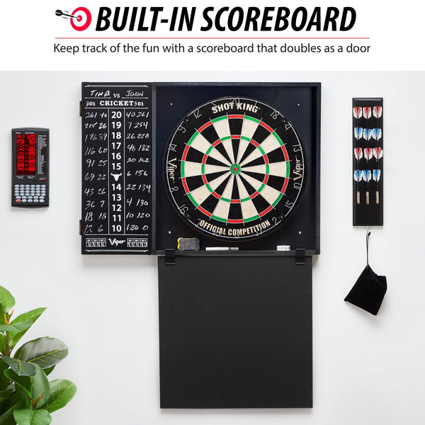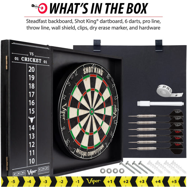 Complete your dartboard experience with the Viper Steadfast Dartboard Backboard Display. Featuring easy installation and expansive coverage, the Steadfast protects your vulnerable wall from errant dart throws. With it? sturdy construction the Steadfast will last for many a game night. The built-in dart storage cabinet is fit for steel tip and soft tip darts alike, holding up to 12 darts (four sets) in glorious display; additional storage pockets hold extra flights, shafts and accessories. Finally, the cabinet door doubles as a chalk scoreboard, with high-definition graphics printed directly onto the black finish. The Steadfast comes included with a Shot King Dartboard and six starter darts, and a preinstalled mounting bracket.