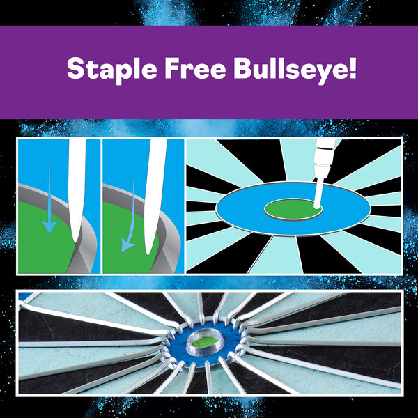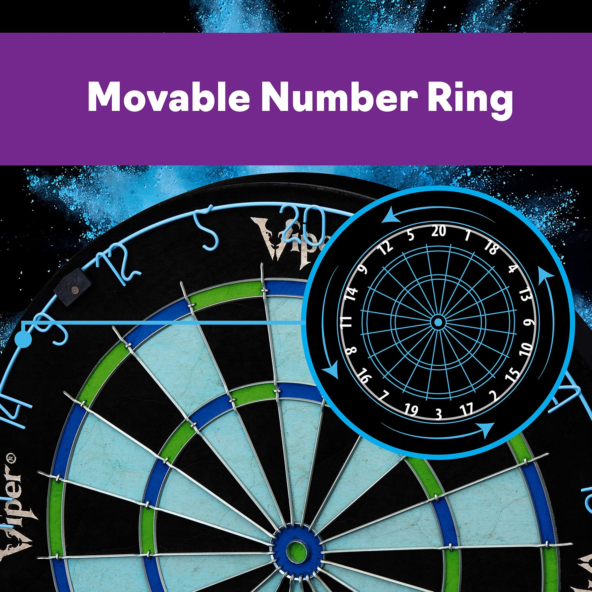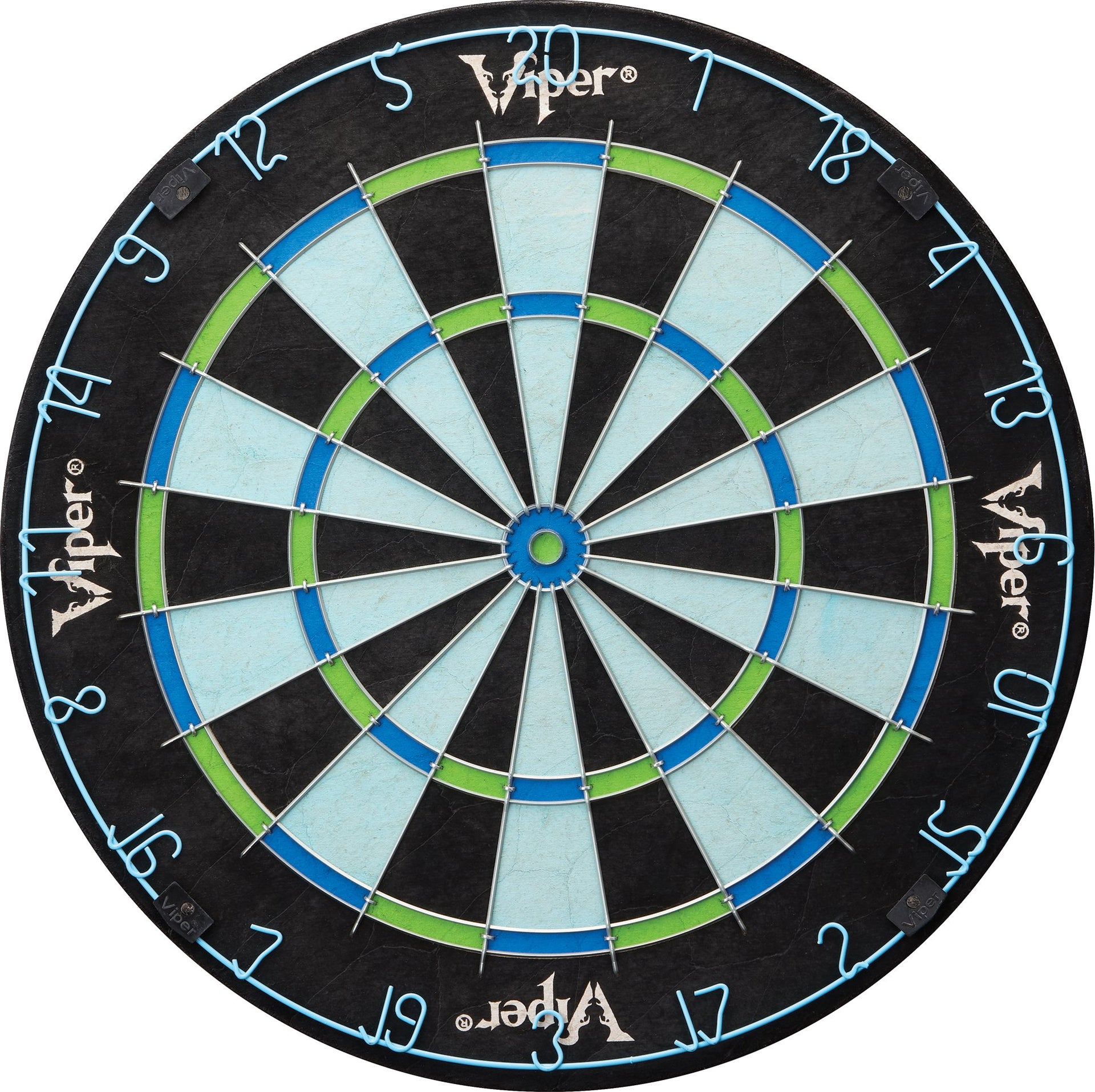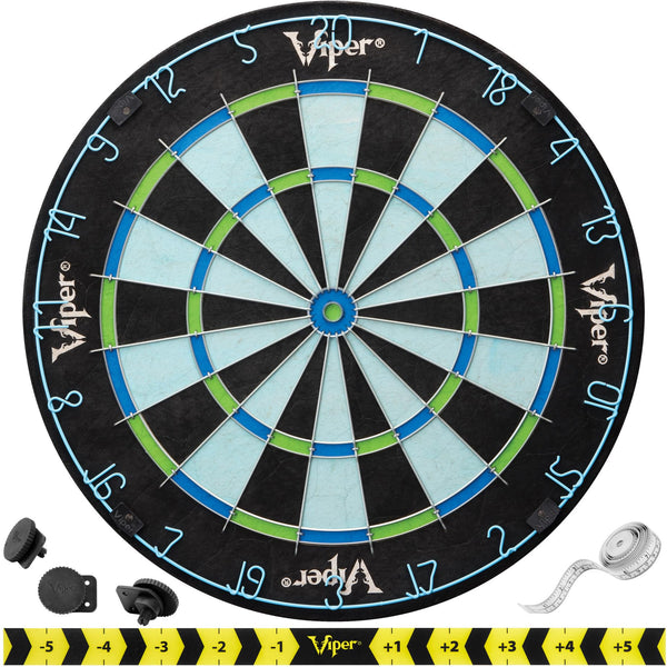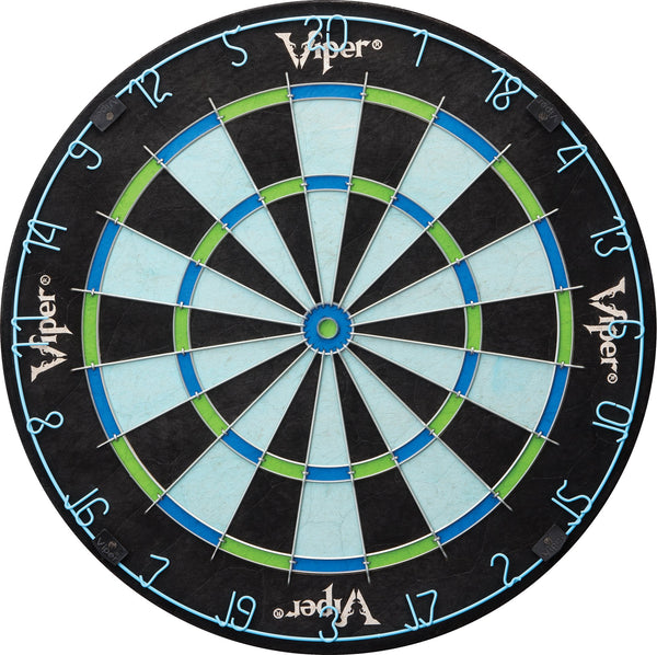 Bring a new life to your dart games with the Viper Chroma sisal dartboard! this dartboard is constructed from compressed sisal fibers, the latest innovation in steel tip darting. Constructing the board this way gives new life to your dartboard, as the special technique allows the sisal fibers to self-heal, as they ''Remember'' their original shape. These dartboards will last years longer than their old school wood or paper counterpoints. What sets the Chroma apart from other dartboards is the high definition color printing in all new shades of Blue and green. This unique color scheme is a first in dartboards of this quality, featuring Real sisal fibers. The Chroma features a 100% staple-free Bullseye. This greatly reduces your chance of a bounce-out occurring while you shoot for a Bullseye, increasing your scores. Other dartboards secure the spider with staples, increasing bounce-outs and frustration. The Chroma also features galvanized triangular spider wire. This gives the spider great durability and strength to last the life of the board. These wires are triangularly shaped, further reducing your chance of a bounce-out, and giving your average score per dart a boost, as darts slide off the wire and into the board. To ensure your board lasts longer, the Chroma dartboard features a movable number ring, just detach and rotate and your Prime spots will move to a fresh point on the board, significantly extending its life! this dartboard includes easy-to-use mounting hardware and a game manual so you can get started right out of the box! you'll find yourself unable to put your darts down after you begin playing on the Chroma sisal dartboard, upgrade your game room today