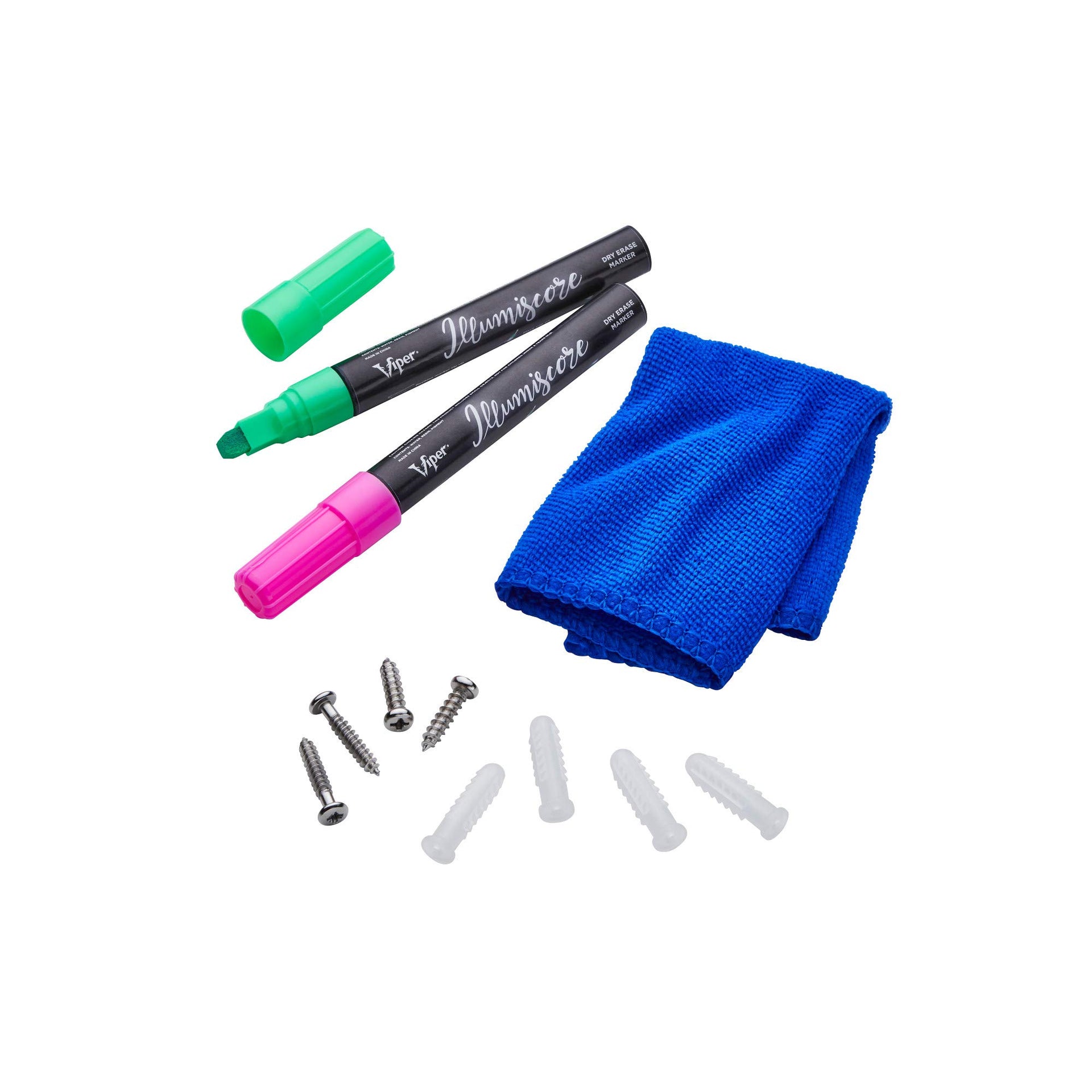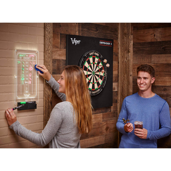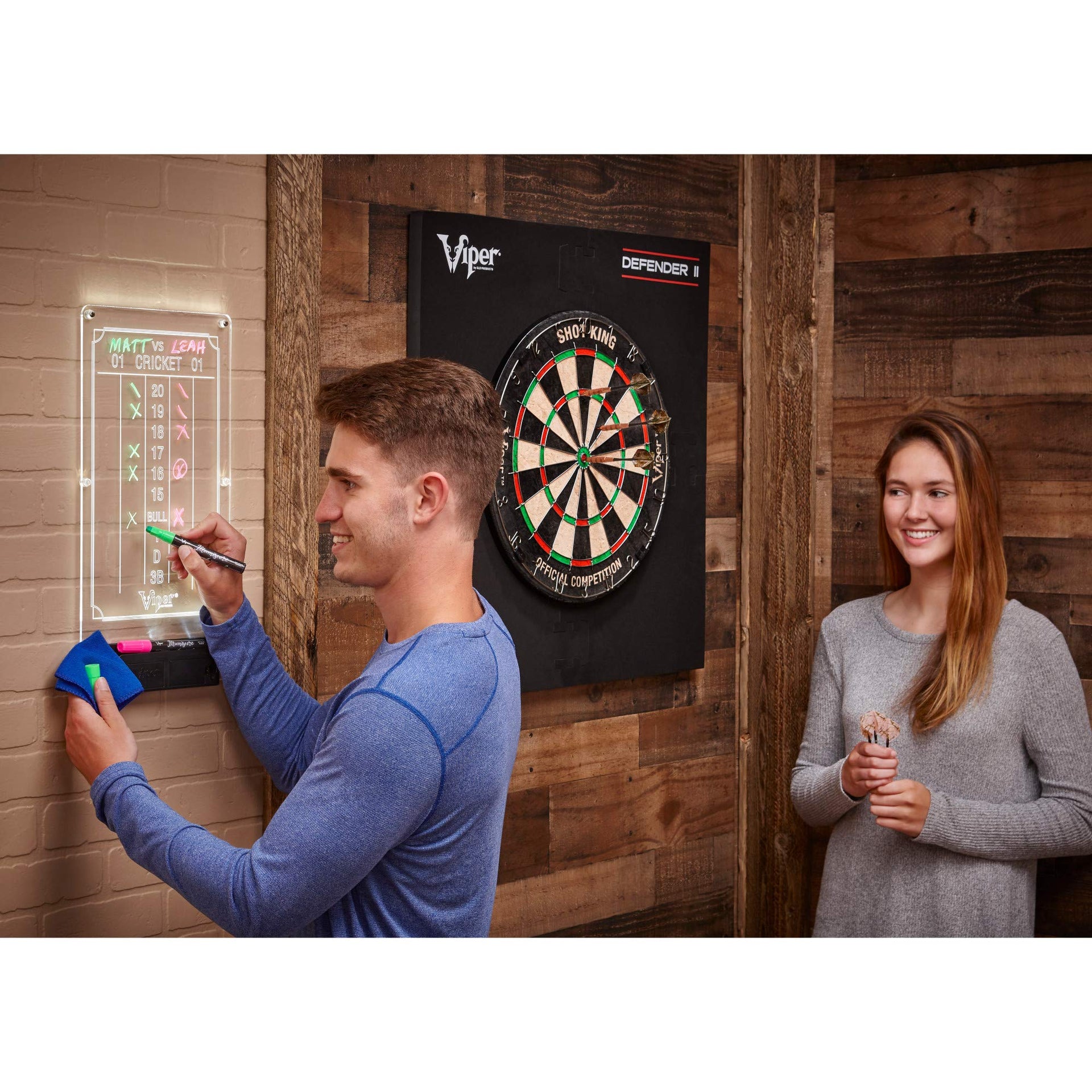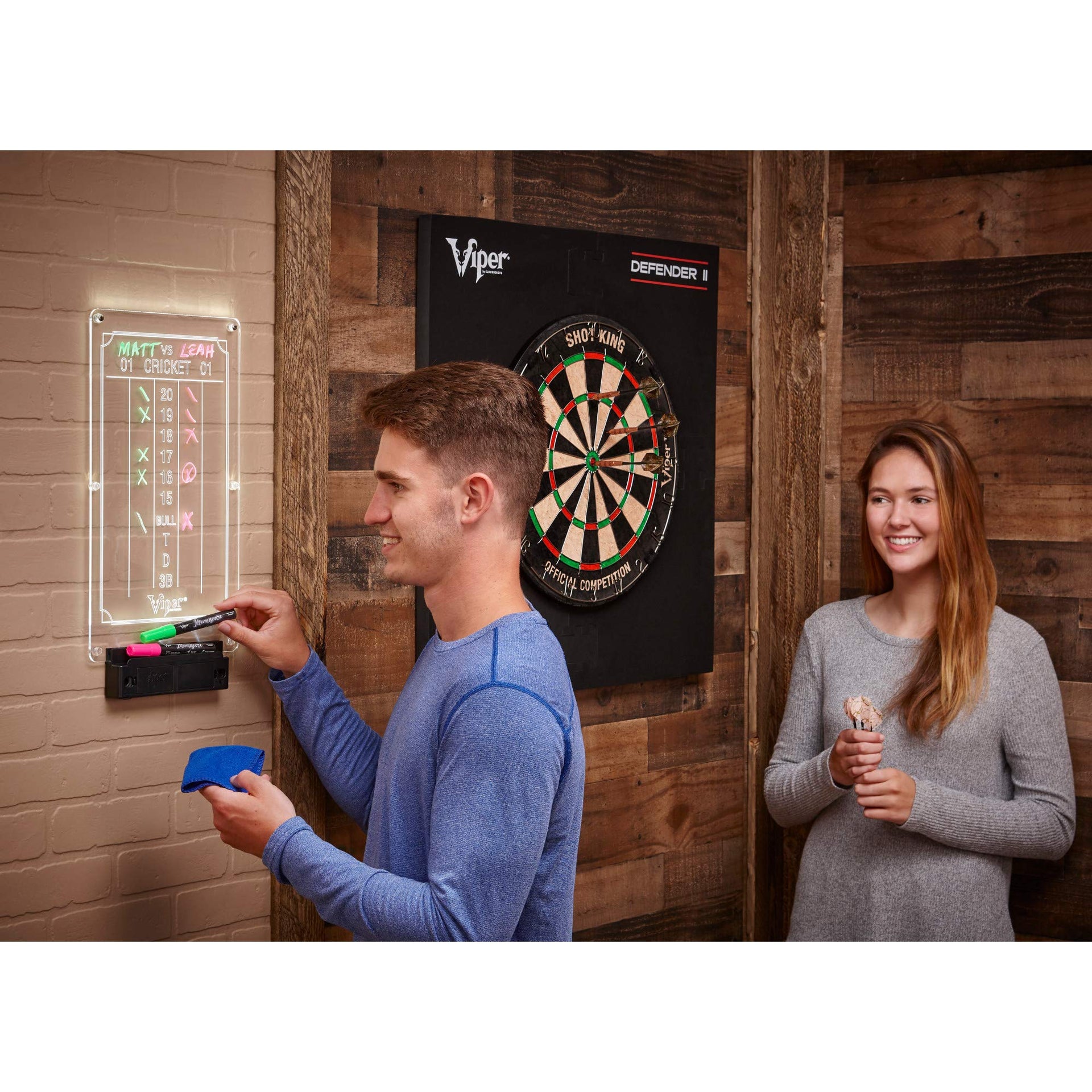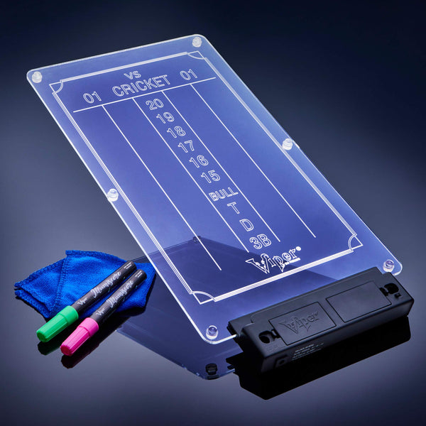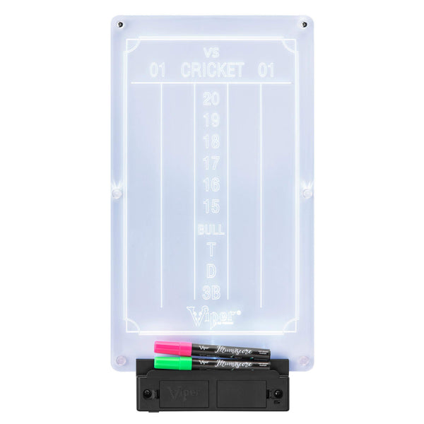 Light up your opponents when they see your scores on the Viper Illumiscore Illuminated Dart Scoreboard Attain the best visibility during your games, so you can see what your next shot needs to be The specially designed pencils (included) will glow brightly when the board is lit No more guessing and scratch paper clean up is a breeze, as the board wipes clean after every game The scoreboard is powered by 4 AA batteries or an optional adapter for two convenient power options Once youAve mastered the art of standard cricket and 01 games, the game manual can put a new spin on to old favorites