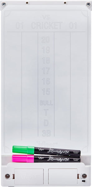Light Up Your Game With The Viper Illumiscore Dart Scoreboard. This Illuminated, Back-Lit Scoreboard Is The Perfect Addition To Any Darters Setup. The Bright Lights Let You Easily See Your Score, Even In Darker Rooms, And The Neon-Colored Markers Add A Splash Of Color To Your Game. Clean Up Is Easy Too, Just Wipe It Clean After Every Game Without Worrying About Messy Chalk. This Dart Scoreboard Is Perfect For Games Of Cricket, 01, And More! The Viper Illumiscore Dart Scoreboard Is Powered By 4 Aa Batteries, Or An Optional Ac Adapter (Both Sold Separately).