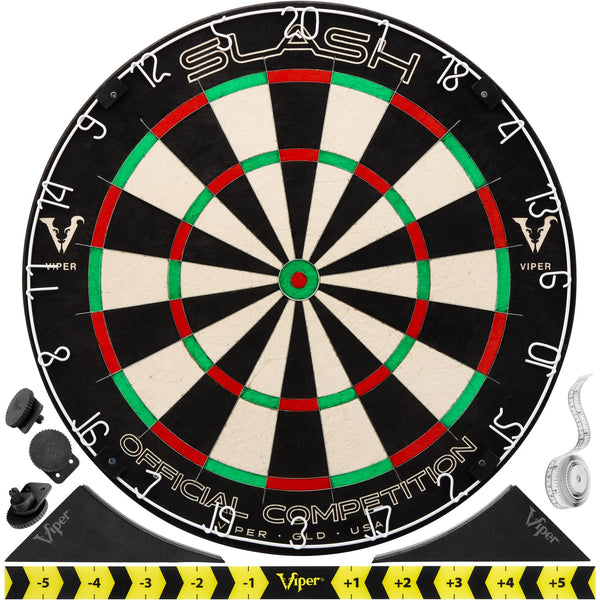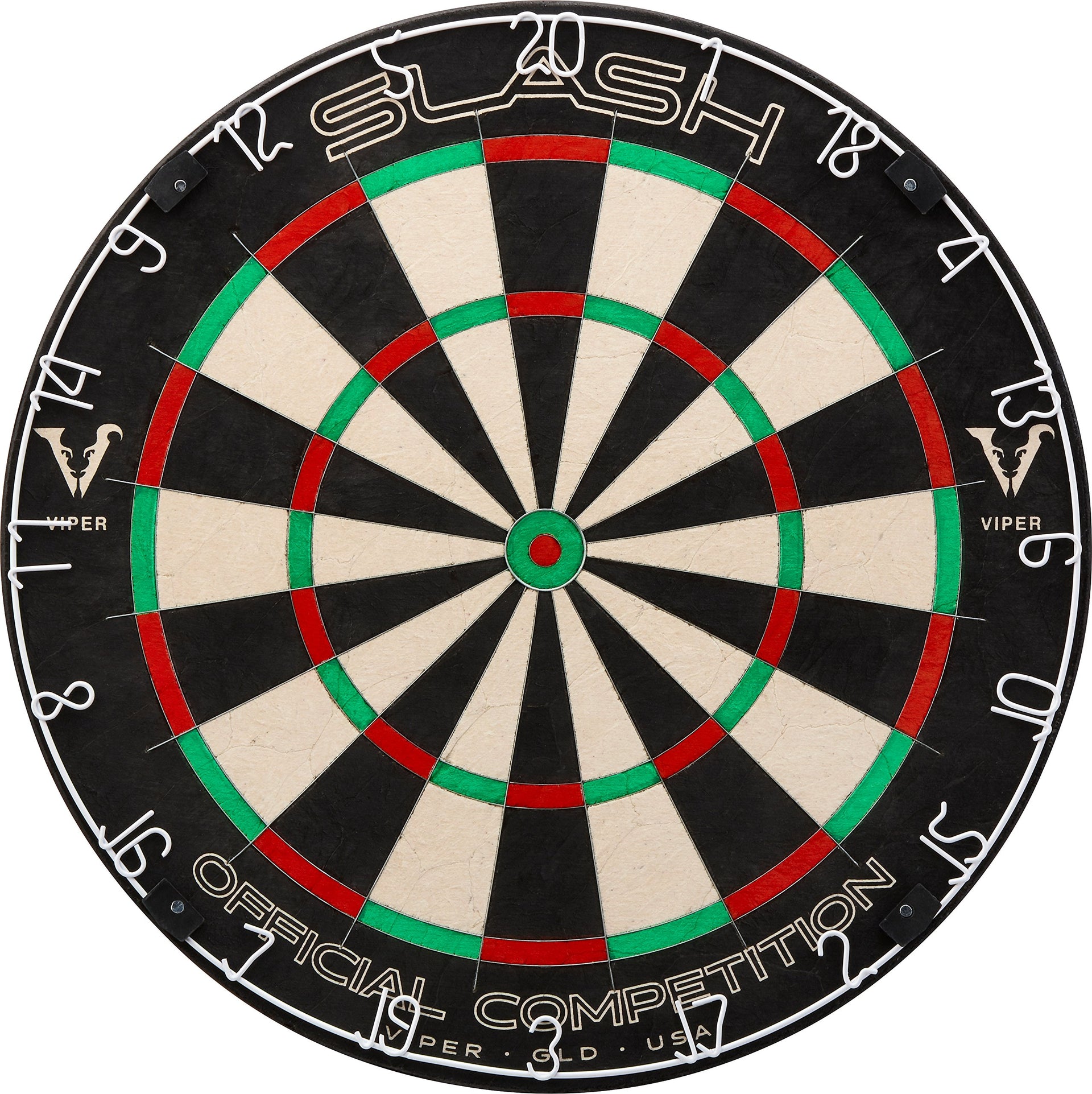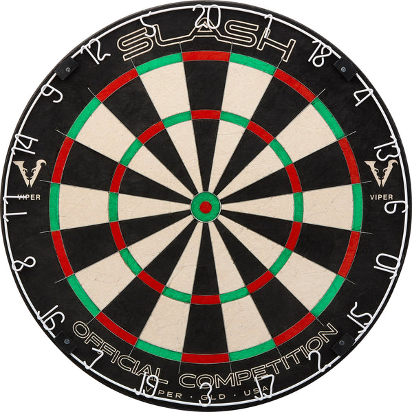 The flagship sisal dartboard from Viper is our most advanced dartboard yet. The Viper slash is constructed from the highest grade African sisal fibers, compressed to the highest density possible. These bristle fibers give the slash its self-healing properties, holes left from dart points seal back to near pristine condition. The ultra dense sisal allows us to include the thinnest razor wire we've ever had on a bristle board. This razor wire increases the scoring area of each segment for higher scores and less bounce outs for a fast-paced game without stopping play. The razor-thin wire and Bullseye are free of traditional staples that can interfere with your game and cause bounce outs. Prepare for tournament play with the slash, its regulation size of 17.75 inch (451 mm) matches perfectly with high level event boards.