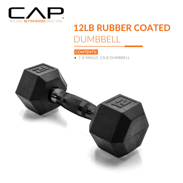 The CAP Coated Hex Dumbbell Weight with Black Hanlde, New Edition has been updated with robust packaging to ensure your dumbbell gets to you in great condition! Our dumbbell ends are made from ASTM A48 Class 20 grey iron with a durable coating and joined together by handle finished in a durable black coating, providing a strong, durable product that will last for years to come. Dumbbells are used to target all major muscle groups, including arms, chest, back, abs, legs and core - so they are essential for any home gym! The CAP Coated Hex Dumbbell Weight offers many benefits when incorporated in exercise routines, which includes muscle building, improving core strength, boosting balance, providing better bone health, burning calories, increasing energy levels, enhancing overall mood and more. Use your CAP Coated Hex Dumbbell for essentially any exercise routine such as isolations, full body, functional, conditional, strength training, and HIIT workouts. Includes 30-day manufacturer warranty.