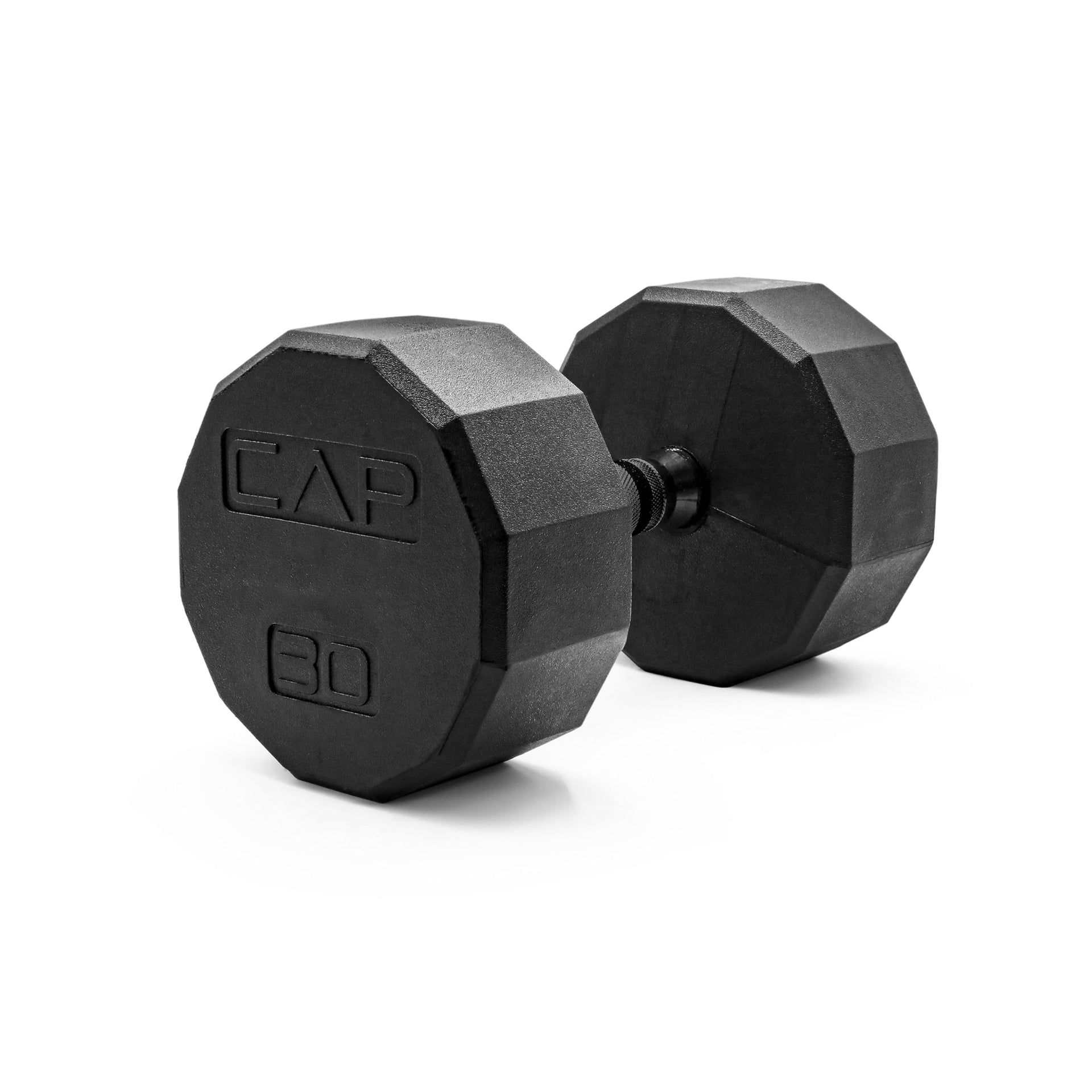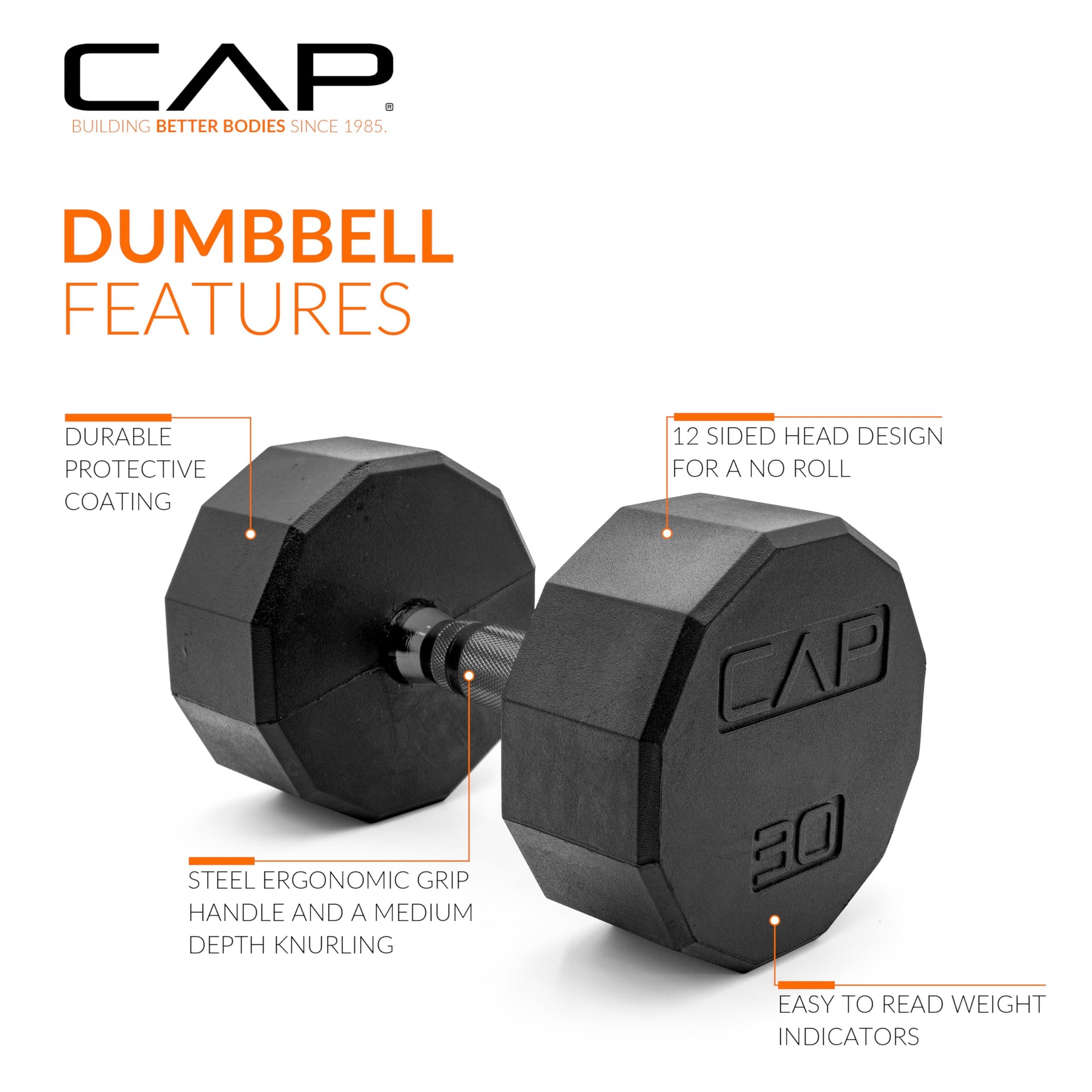 Add a CAP 12-Sided Coated 30 LB Black Handle Dumbbell or two to your home gym to add versatility to your workouts and gain muscle mass. Dumbbells are used to exercise all major muscle groups, including arms, chest, back, abs, legs and core. The benefits of dumbbell exercises include muscle building, improving core strength, boosting balance, providing better bone health, burning calories, increasing energy levels, enhancing overall mood and more. Dumbbells are perfect for iOS, full body, functional training and HIIT workouts. The CAP 12-Sided Coated Dumbbell ends are made from ASTM A48 Class 20 grey iron, durable coating, and are joined together by a solid 1018 cold rolled steel chromed handle, providing a strong, long-lasting product.