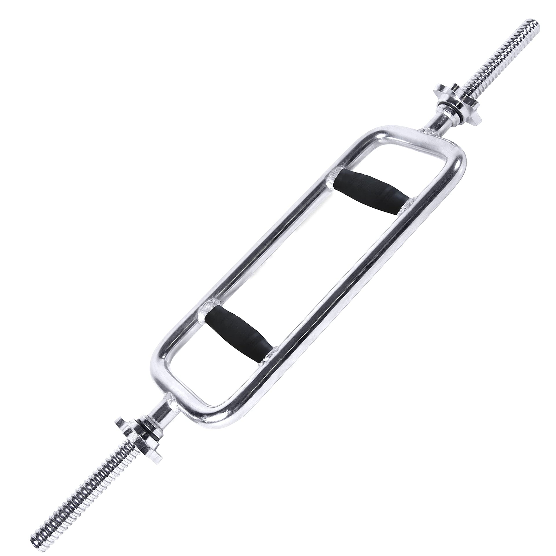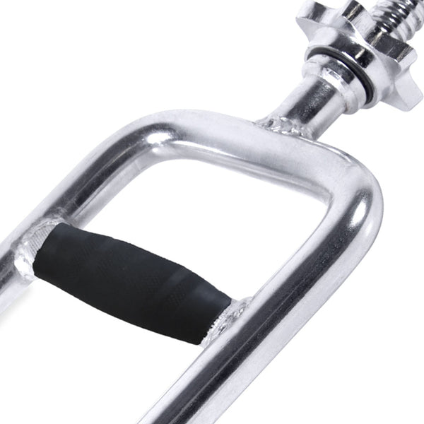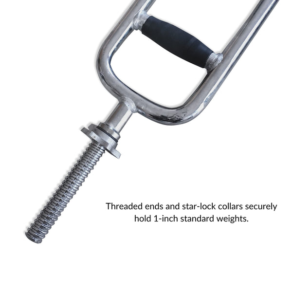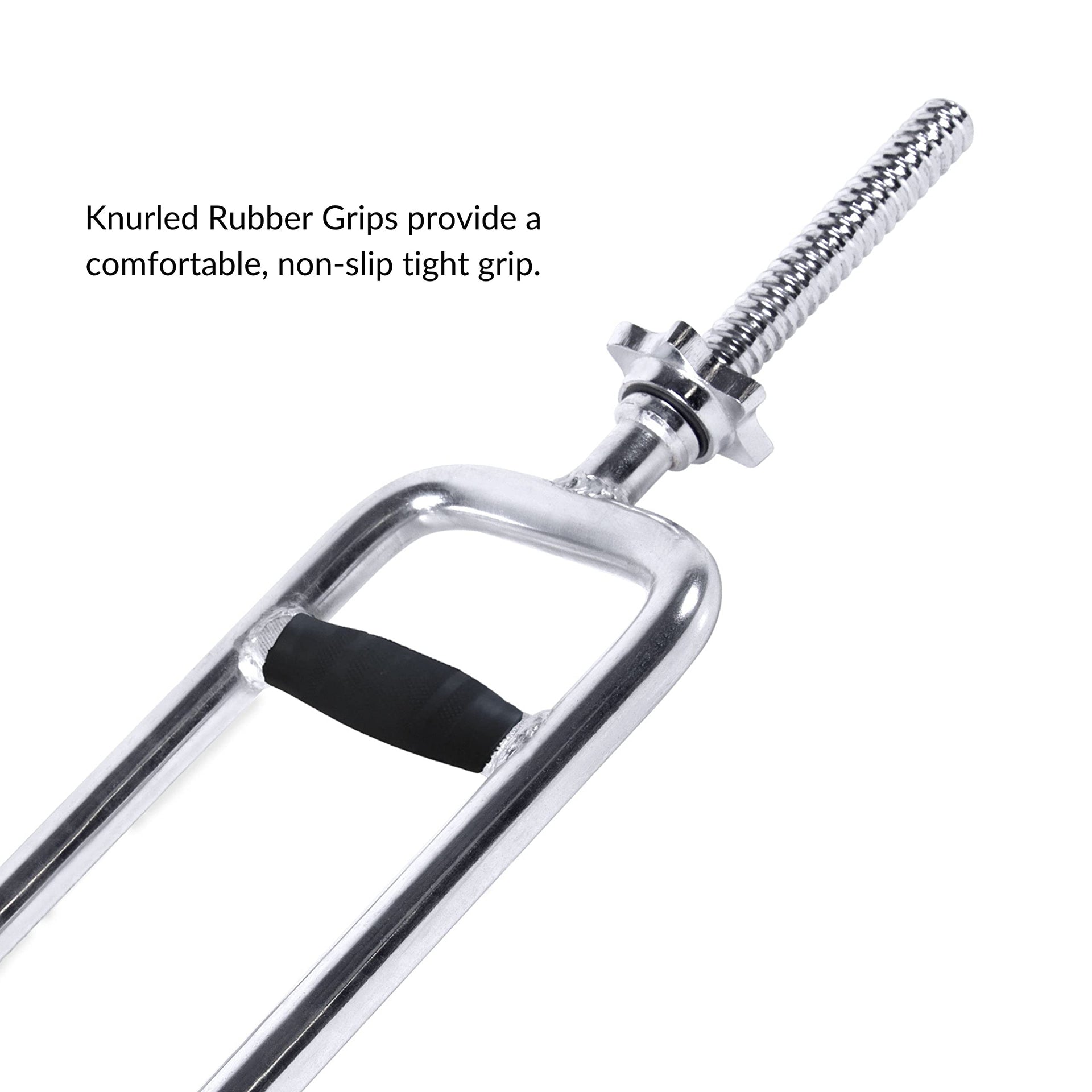 Target your triceps and upper body in comfort with CAP 34'' Regular Threaded Triceps Bar with Rubber Grips. This CAP Threaded Triceps Bar features rubber grips for a comfortable, non-slip grip. The threaded ends and star lock collars provide a secure load during your strength training routine. The solid steel construction and chrome finish protect the bar for long-lasting performance and durability. Built to accommodate 1-inch weight plates, this bar can hold a maximum weight capacity of 200lbs and has an 6-inch loadable sleeve length.