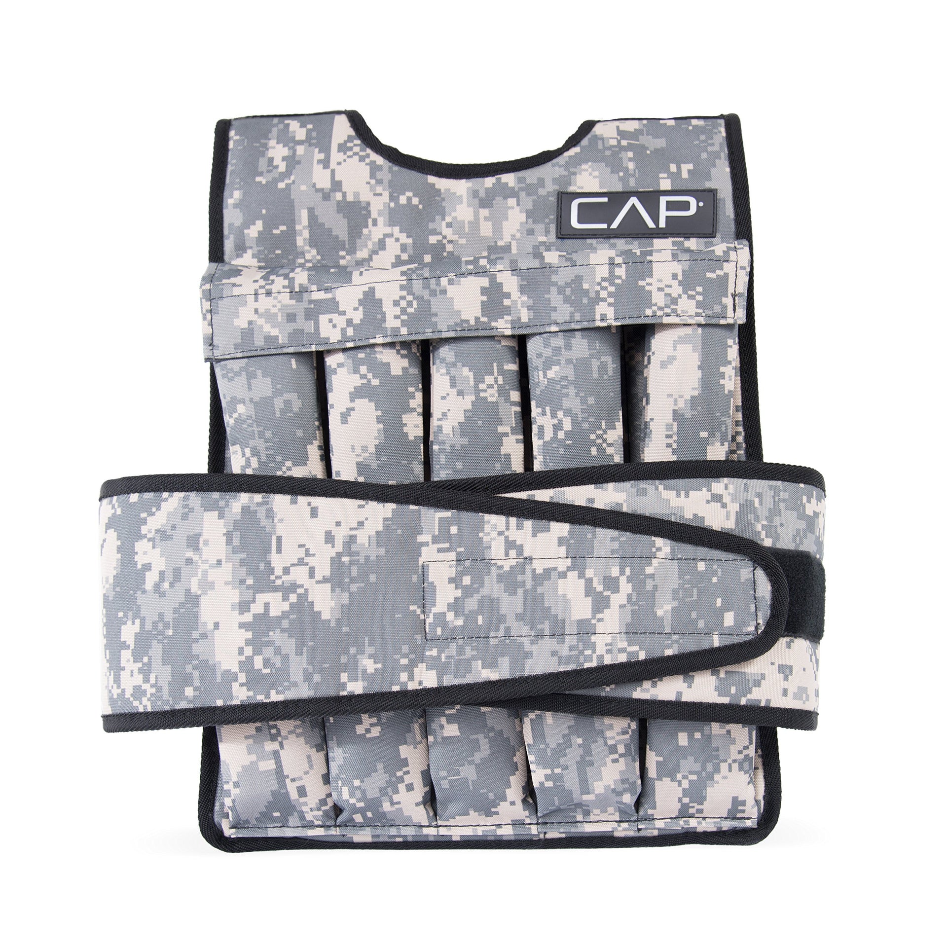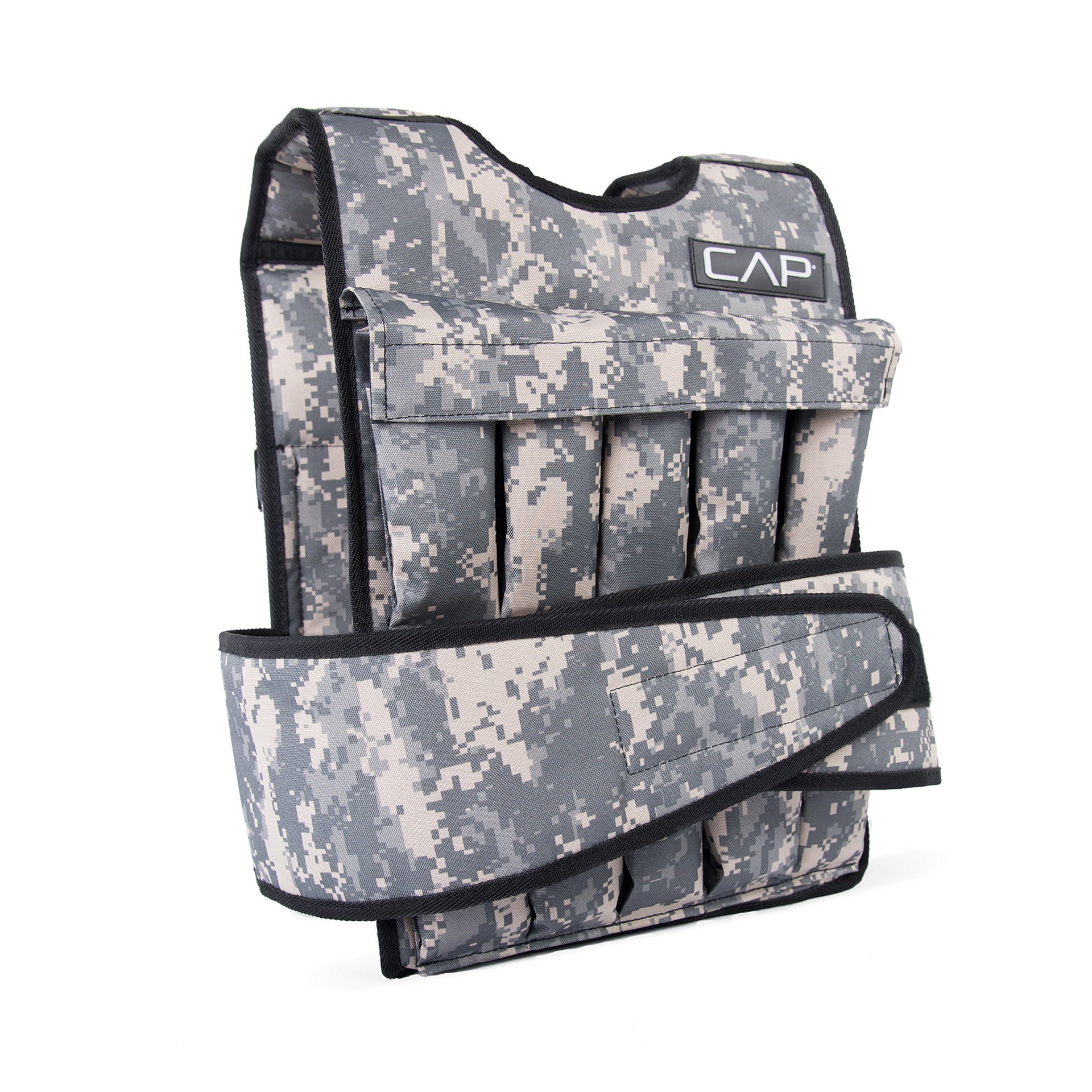 The CAP Barbell 40 Pound Adjustable Weighted Vest in Digital Camouflage can help you improve strength, agility, speed, endurance and much more! This vest is made from reinforced nylon and polyester for a comfortable and durable fit. The fully adjustable touch-and-close fastener for the waist belt fits most people and padded shoulder straps offer a snug and secure fit. The removable weights can be added or removed from the vest to reach your desired weight capacity and each weight packet is filled with 4 pounds of iron ore fines. This weighted vest is ideal for resistance training for any body weight training program and offers many health benefits such as improved cardiovascular, increased muscle mass, higher calorie burn, and more. This vest is machine washable; remove all weight packets before washing. Air dry. Do not use for water activities.