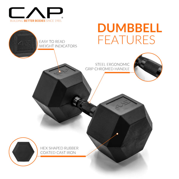 The CAP Coated Hex Dumbbell Weight Pair with Black Handle, New Edition has been updated with robust packaging to ensure your dumbbell gets to you in great condition! Our dumbbell ends are made from ASTM A48 Class 20 grey iron with a durable coating and joined together by handle finished in a durable black coating, providing a strong, durable product that will last for years to come. Dumbbells are used to target all major muscle groups, including arms, chest, back, abs, legs and core - so they are essential for any home gym! The CAP Coated Hex Dumbbell Weight Pair offers many benefits when incorporated in exercise routines, which includes muscle building, improving core strength, boosting balance, providing better bone health, burning calories, increasing energy levels, enhancing overall mood and more. Use your CAP Coated Hex Dumbbell for essentially any exercise routine such as isolations, full body, functional, conditional, strength training, and HIIT workouts. Includes 30-day manufacturer warranty. **This item will be delivered in two separate boxes, which may arrive on different days or at different times.