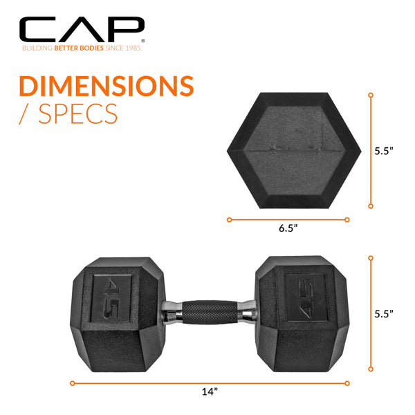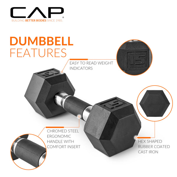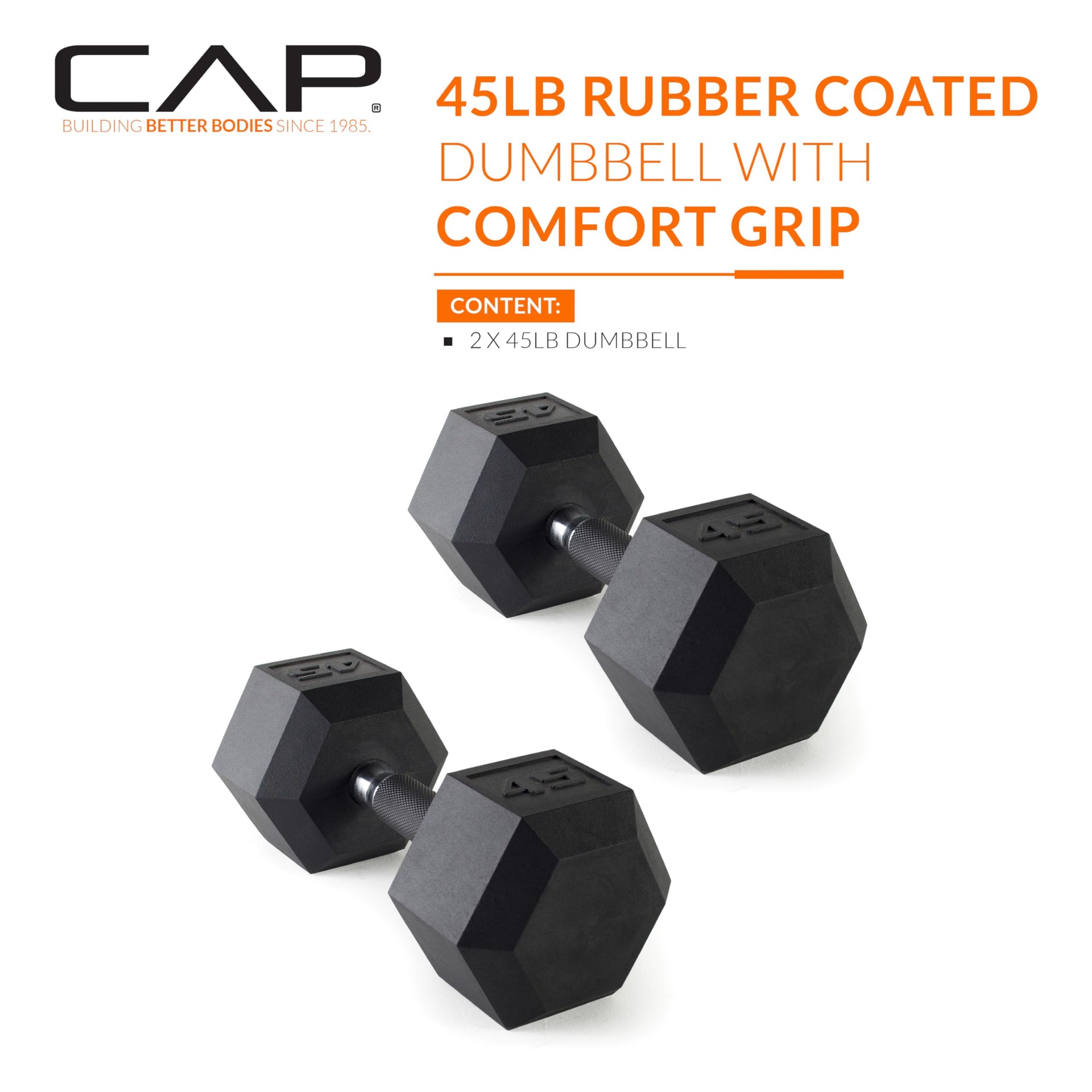 The CAP Coated Hex Dumbbell Weight Pair with Padded Grip, New Edition has been updated with robust packaging to ensure your dumbbell gets to you in great condition! Our dumbbell ends are made from ASTM A48 Class 20 grey iron with a durable coating and joined together by handle finished in a durable black coating, providing a strong, durable product that will last for years to come. Dumbbells are used to target all major muscle groups, including arms, chest, back, abs, legs and core - so they are essential for any home gym! The CAP Coated Hex Dumbbell Weight Pair offers many benefits when incorporated in exercise routines, which includes muscle building, improving core strength, boosting balance, providing better bone health, burning calories, increasing energy levels, enhancing overall mood and more. Use your CAP Coated Hex Dumbbell for essentially any exercise routine such as isolations, full body, functional, conditional, strength training, and HIIT workouts. Includes 30-day manufacturer warranty.