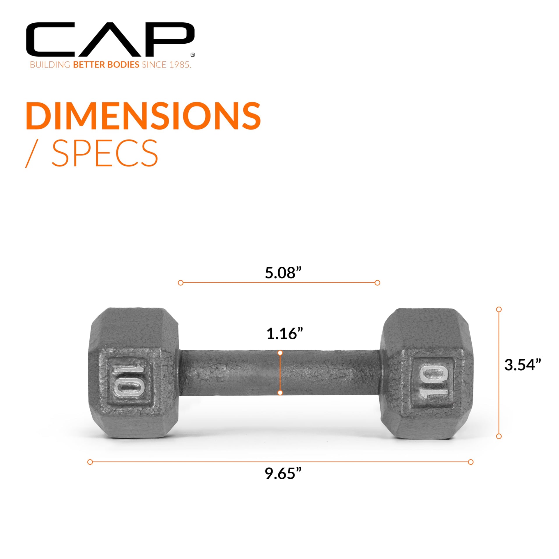 Discover the versatility and effectiveness of the CAP Original Hex Cast Iron Dumbbells, meticulously designed to target every major muscle group with precision. Crafted from ASTM A48 Class 20 grey iron, these durable dumbbell heads are securely joined by a 1018 cold rolled solid steel handle, ensuring robustness and longevity. Ideal for building muscle, enhancing core strength, and promoting overall balance, these dumbbells offer a comprehensive fitness solution. Their hexagonal heads prevent rolling, providing stability during storage and facilitating seamless transitions between exercises. The medium depth knurling on the handle guarantees a secure grip, enhancing comfort and safety throughout your workout regimen. Finished with a resilient industrial enamel coating, these dumbbells not only resist wear and tear but also maintain their aesthetic appeal over time. Experience the benefits of incorporating dumbbell exercises into your routine, from increased bone health and calorie burning to elevated energy levels and improved mood. Elevate your fitness journey with the CAP Original Hex Cast Iron Dumbbells, a testament to quality craftsmanship and functional design.
