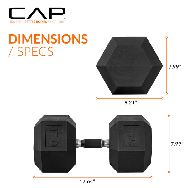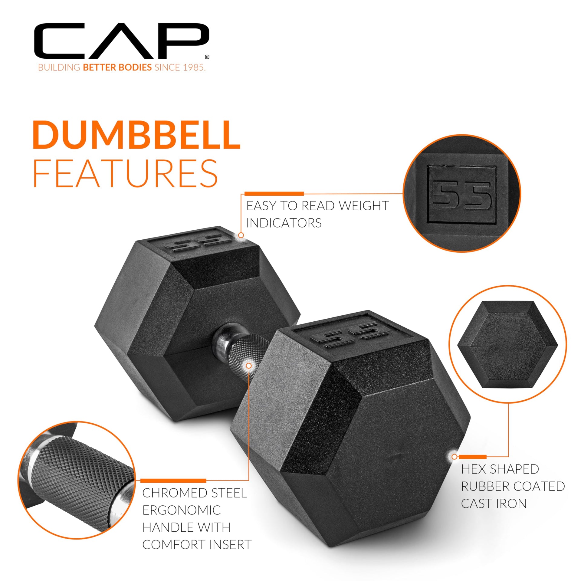 These dumbbells incorporate commercial gym durability with comfort and affordability. Dumbbells are used to exercise all major muscle groups, including arms, chest, back, abs, legs and core. The benefits of dumbbell exercises include muscle building, improving core strength, boosting balance, providing better bone health, burning calories, increasing energy levels, enhancing overall mood and more. Dumbbells are perfect for isolations, full body, functional and HIIT workouts. The CAP Barbell Coated Dumbbell heads are made from ASTM A48 Class 20 grey iron with a durable coating and joined together by a solid 1018 cold rolled steel chromed handle.