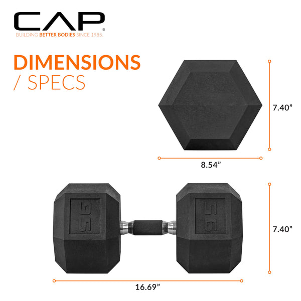 These dumbbells incorporate commercial gym durability with comfort and affordability. Dumbbells are used to exercise all major muscle groups, including arms, chest, back, abs, legs and core. The benefits of dumbbell exercises include muscle building, improving core strength, boosting balance, providing better bone health, burning calories, increasing energy levels, enhancing overall mood and more. Dumbbells are perfect for isolations, full body, functional and HIIT workouts. The CAP Barbell Coated Dumbbell heads are made from ASTM A48 Class 20 grey iron with a durable coating and joined together by a solid 1018 cold rolled steel chromed handle.