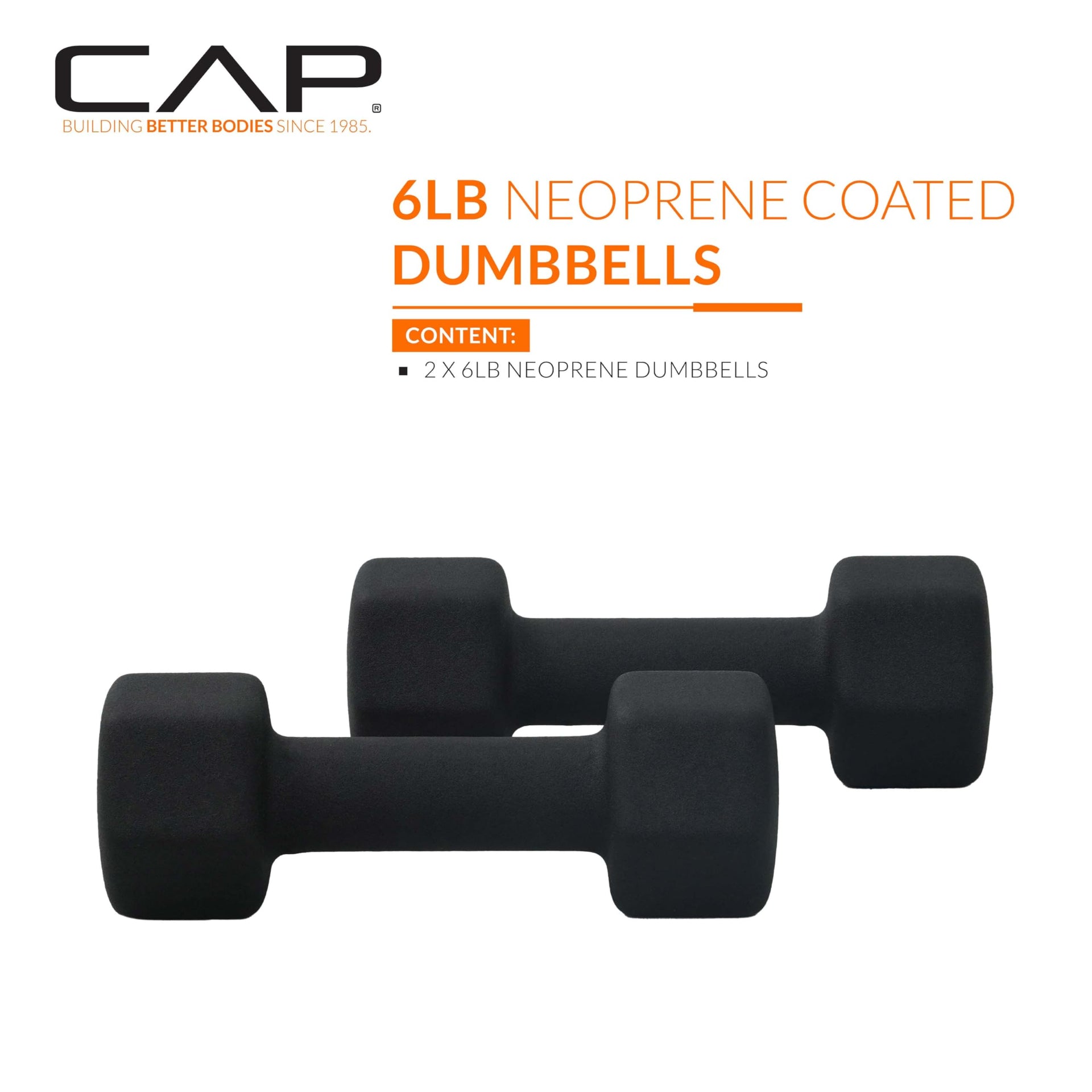 Introducing our latest CAP Neoprene Dumbbell Weights, updated with a new robust packaging! Each dumbbell features an iron core precision dipped in 3mm of neoprene and showcases the poundage on each end for easy identification. The neoprene coating provides a comfortable, non-slip surface during workouts, while the hexagon shape prevents rolling. Incorporate a pair of dumbbells into essentially any fitness routine, including resistance training, endurance training, HIIT workouts, barre, yoga, Pilates, and more. Dumbbells offer many benefits including building muscle, improving core strength, boosting balance, better bone health, burning more calories, increased energy levels, enhanced overall mood and more! Includes TWO 6 LB neoprene coated weights.