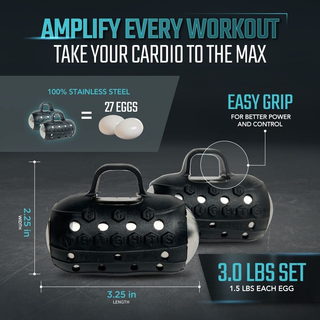 Egg Weights are made from high-density metals, Egg Weights are up to 3x denser than traditional hand weights The palm-centered, ergonomic design allows you to perform at high intensity with fluid movement complete with a high traction grip and finger loop, Egg Weights are easy to pick up and hard to put down Amplify your existing training program and burn 30-60% more calories (as proven in lab testing)