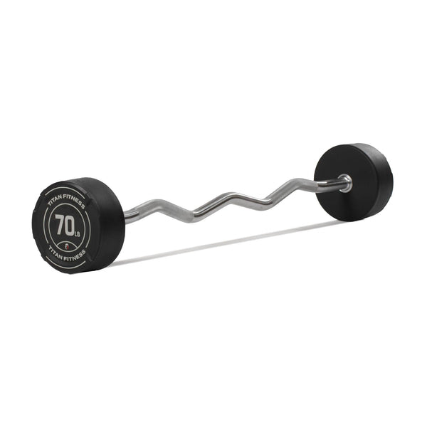 The EZ Curl Fixed Rubber Barbell is a compact, pre-loaded bar designed for home or garage gyms with limited space. These well-balanced bars cater to the needs of powerlifters, bodybuilders, Olympic weightlifters, and anyone focused on enhancing overall strength. This 70 LB bar, featuring a 30mm curved shaft, suits both novices and experienced weightlifters. Crafted from cold-rolled steel and hard-chrome-coated, it provides a comfortable grip with medium textured knurling and a single knurl mark for added convenience. This versatile bar is suitable for bicep curls, skull crushers, preacher curls, hammer curls, or triceps extensions and it requires no setup, making it easy to store and transport for your workouts.FEATURES:- 30mm pre-loaded barbell with high-quality rubber weights at both ends- Ideal for weightlifters of all levels in compact workout spaces- Ergonomic, curved handle provides a comfortable, stable grip- Medium-textured knurl featuring a single knurl mark for a secure grip on each lift- Cold-rolled steel bar with hard-chrome coating- Embossed rubber heads with weight indication- Designed to be balanced and long-lastingSPECIFICATIONS:- Overall Width: 45.25-in.- Grip Width: 38.75-in.- Grip Diameter: 30mm- Rubber Height: 7.75-in.- Rubber Width: 3.25-in.- Knurling: Medium Diamond Texture- Finish: Hard Chrome- Material: Cold-Rolled Steel- Product Weight: 70 lb.