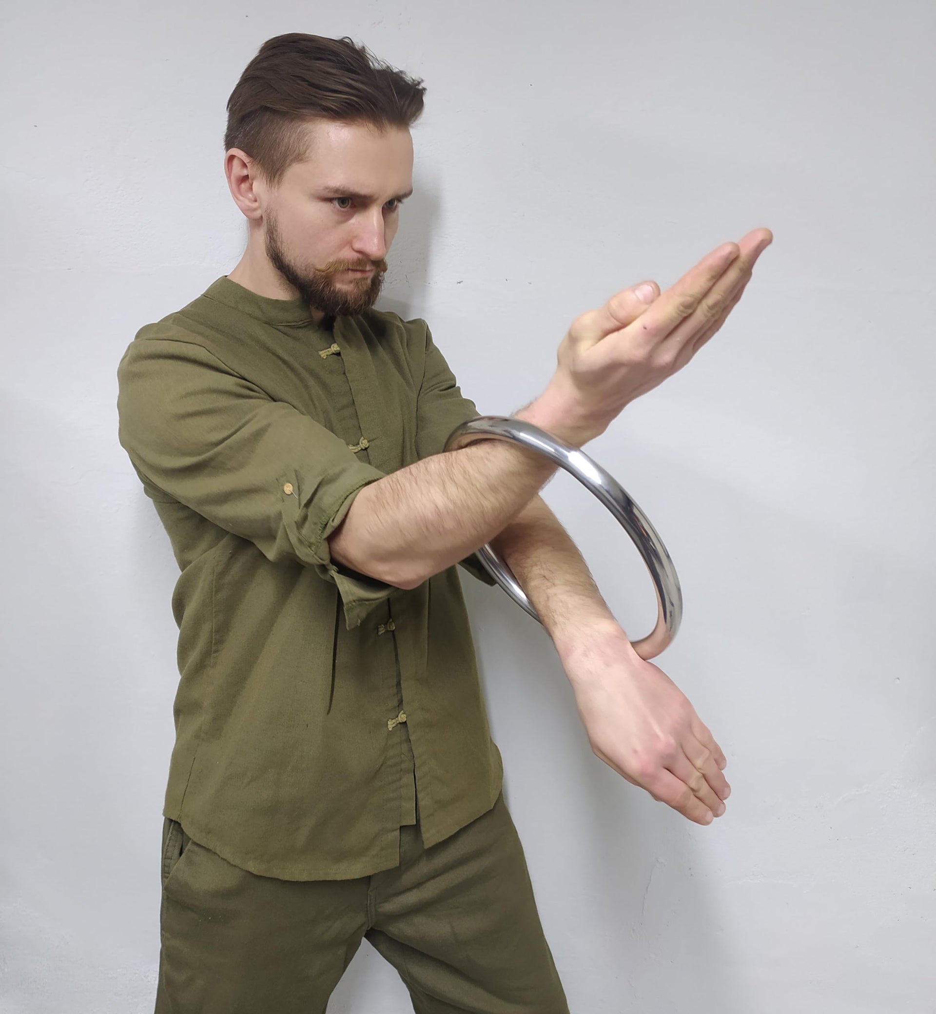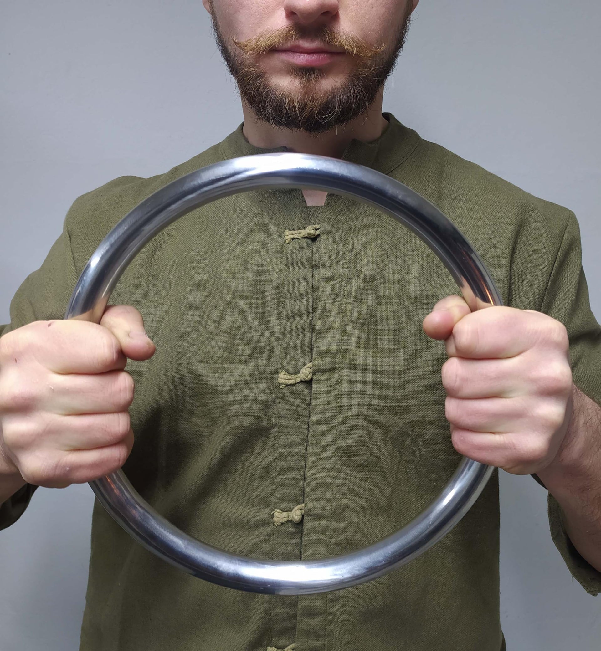 This device helps develop the ability to use your arms in a confined space, by keeping your elbows on the centerline. It teaches the user to keep the arms chambered, the body and horse straight and supportive, the stance spaced properly and the footwork strong yet swift. Helps keep the hands drawn with the elbows in while executing a hand maneuvers. Use of the rattan ring teaches the use of the power that comes up from beneath the elbows, and teaches the practitioner to fight when there is a constant force on the bridges such as occurs in actual combat. Use of the bamboo/rattan ring will build relaxed power, instill proper fighting posture, and permit the proper execution of speed and Jing (power). It is also very effective at teaching the skill of feeling or sensitivity, an essential part of Chi Sao. Smaller rings are for more close in, elbows in training which relates most to close in fighting and grappling. The Taan Hiun as it is called in Cantonese is typically associated with the Wing Chun Kung Fu system but is in fact one of the Jongs, or wooden training aids inherited from the Shaolin Temple. It's use can be seen in a variety of Southern Kung Fu systems particularly those linked to the Hakka people, which tend to focus on short distance fighting and centerline control. It use is more often seen in the Wing Chun system but this device is also used other styles such as Chow Gar, Bak Mei, Bak Hok Pai and others. Its use will benefit practitioners of any style of martial art.