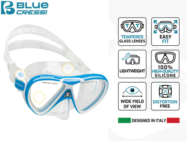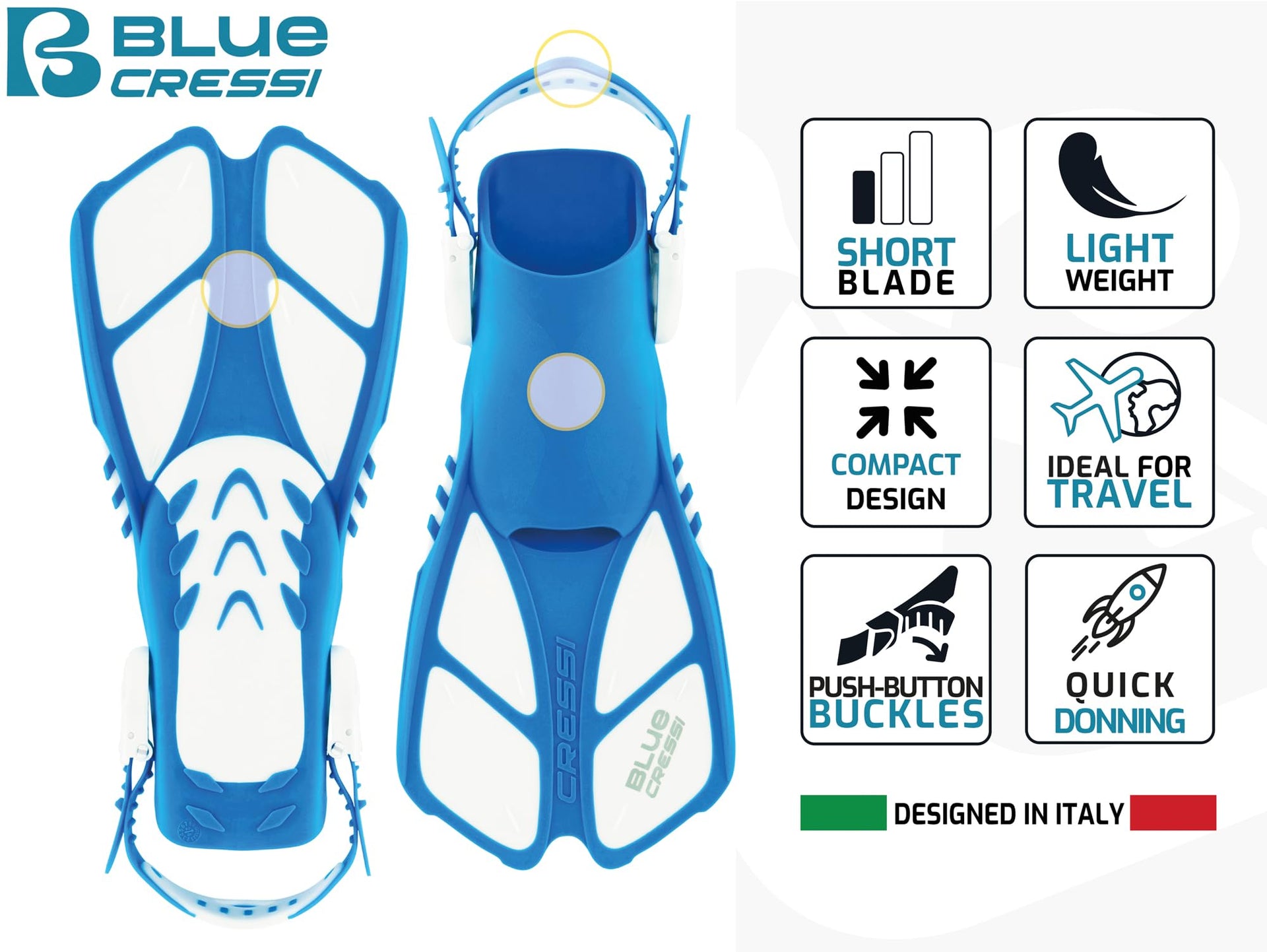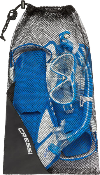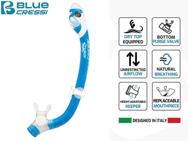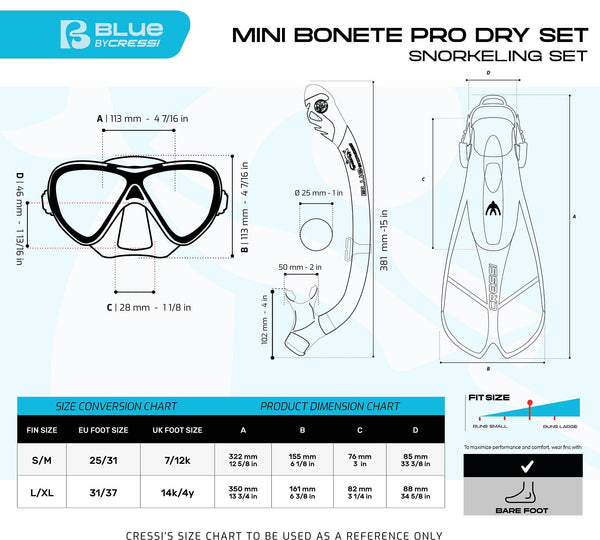 The Mini Bonete set is lightweight, inexpensive, and ideal for young snorkelers eager to discover the underwater world. The mask, snorkel, and fins are made with soft and hypoallergenic silicone to ensure comfort and ease of use. The mask features tempered glass lenses and side buckles to easily adjust strap length. The snorkel includes a keeper that can be clipped onto the mask strap. Equipped with a dry-top valve, the snorkel seals the breathing tube when submerged, preventing water from entering the airway. The Bonete fins are short open heel fins with adjustable straps. With their lightweight design and soft foot pockets, these fins ensure relaxed and comfortable finning. The Mini Bonete set is designed by Cressi and made in China. Cressi has been an Italian brand pioneer in Scuba Diving, Snorkeling and Swimming equipment.