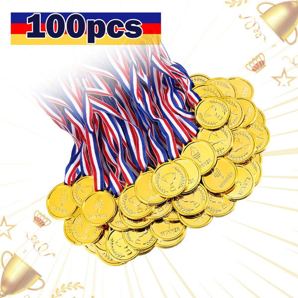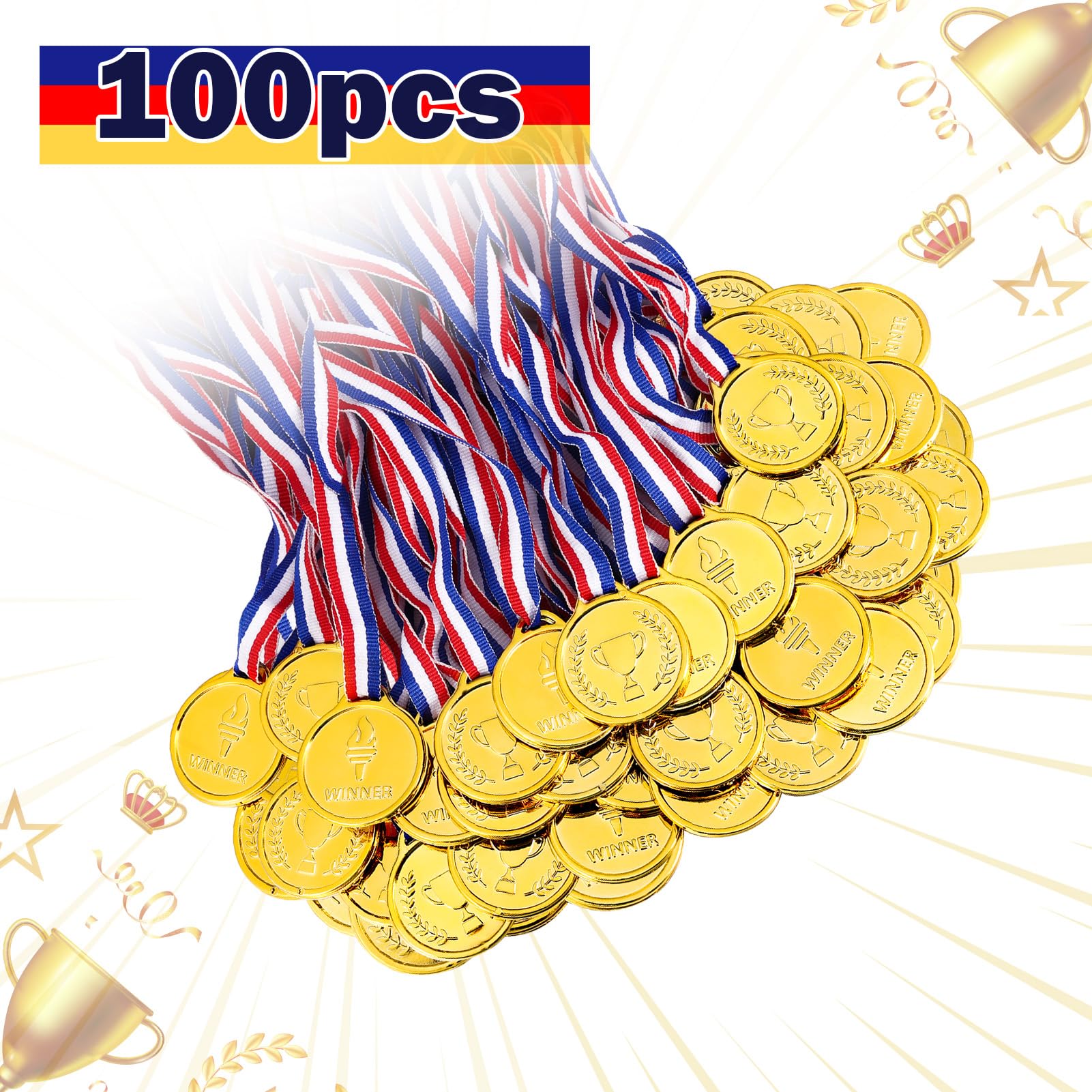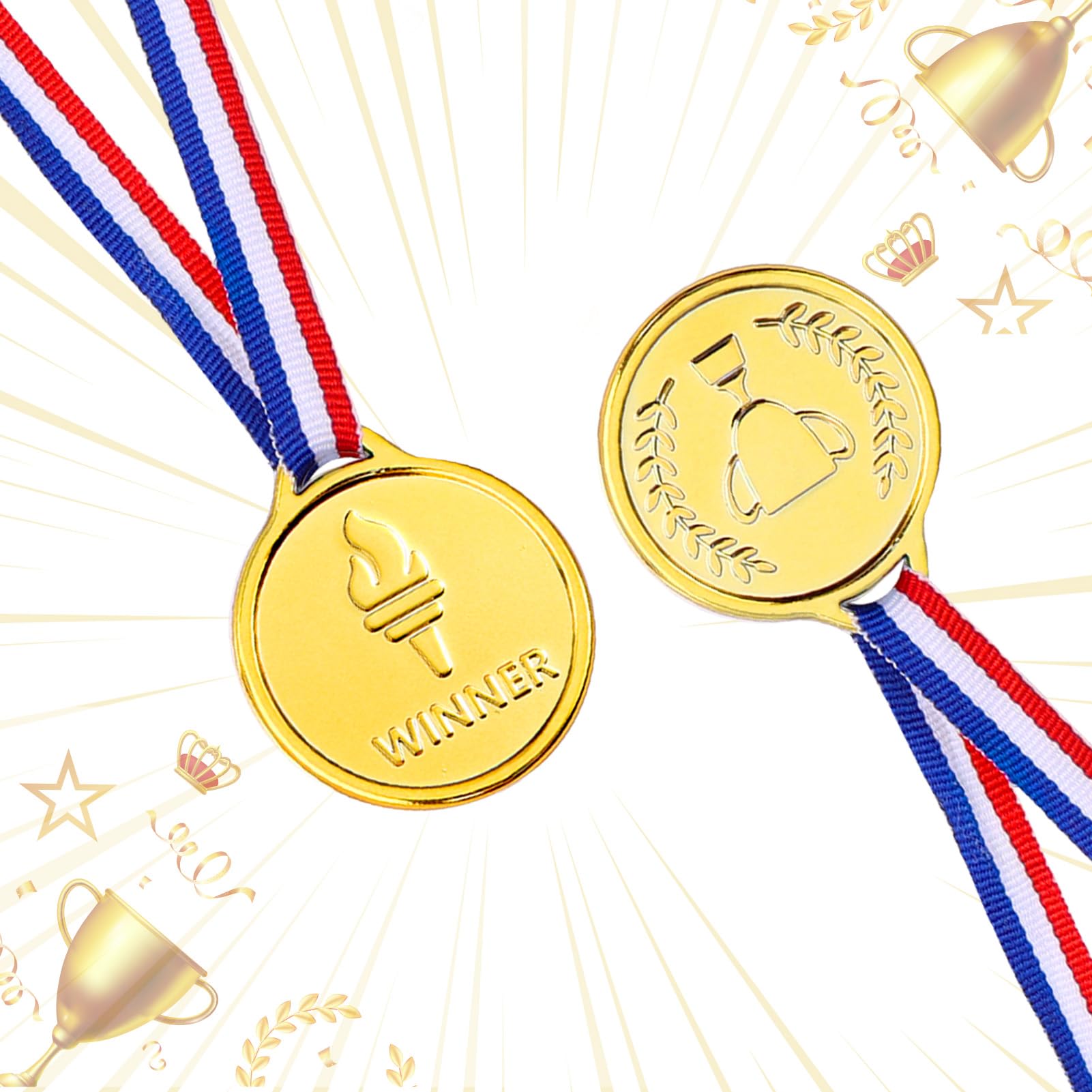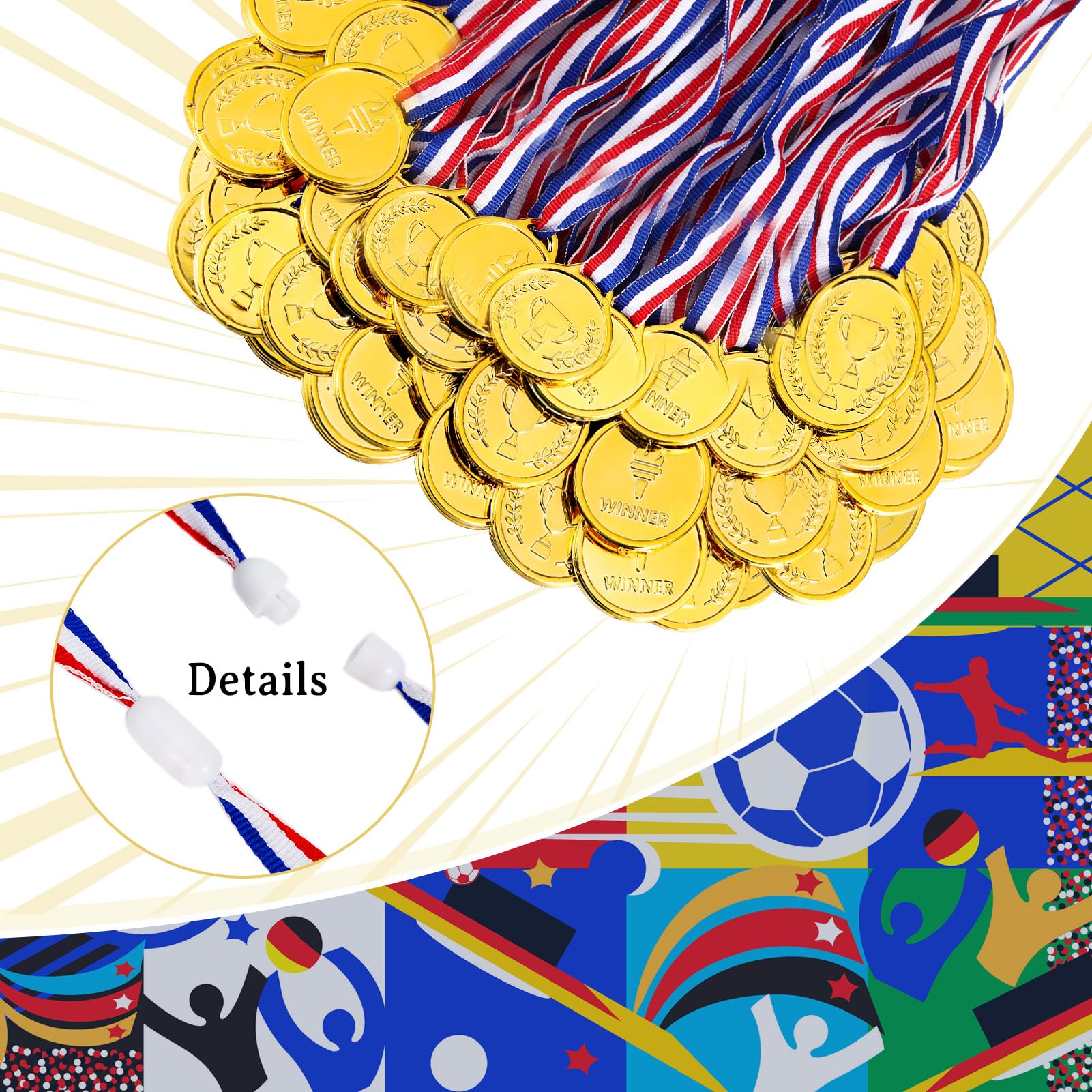 Caydo Plastic Goldtone ''Winner'' Medals Specifications Material: plastic + nylon ribbon Ribbon length: Approx 28 cm (11.02 inches) Winner diameter: Approx 3.5 cm (1.38 inches) Necklace's color: red, white and blue Quantity: 100pcs Package included 100 x Winners Medal