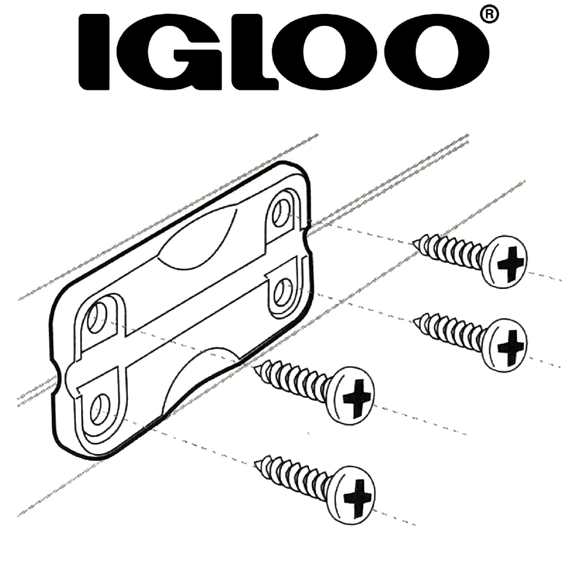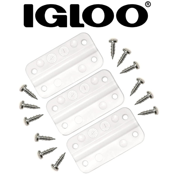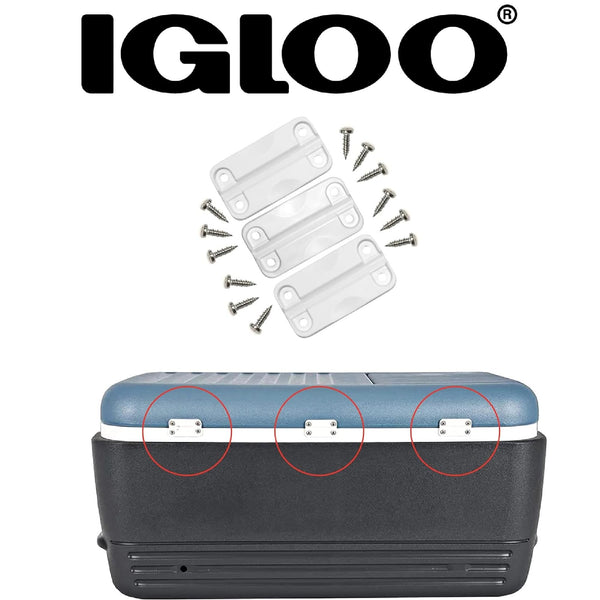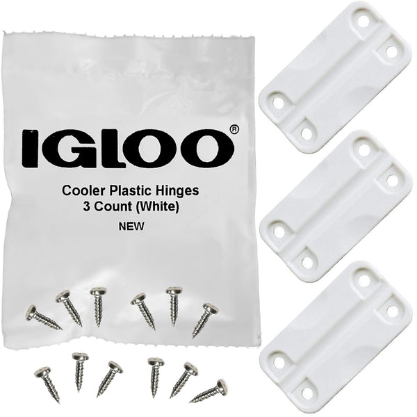 Made by Igloo. Fits Igloo 25-165 Qt rectangular-shaped, hinged coolers. Igloo cooler parts contain UV inhibitors to protect against sun damage and breakdown, and are rugged and durable for a long cooler life. Living hinge design. Hinge Size: 2-5/16'' x 1-1/4''. Width from center hole to center hole: 1-13/16''. Height center hole to center hole: 5/8''. 3 plastic hinges and 12 stainless screws included. Easy to Install. Made in the USA.