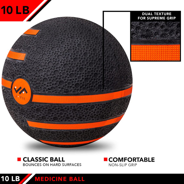 A superior alternative to free weights, these multipurpose weighted medicine balls provide optimal heaviness for resistance to increase endurance, coordination, muscle strength. Made with durable rubber and a strong construction that will not puncture, the dual grip texture allows for a comfortable secure hold. Incorporate the JFIT medicine ball into your usual squats, sit-ups, push-ups, and lunges, making your routine more challenging and fun. Suitable for beginners, athletes, professional lifters, yoga instructors, gym rats, and everyone in between, our medicine ball helps improve balance, core strength, as well as muscle and posture. Our medicine balls for men and women are a great tool for post-injury, easier to use than dumbbells, and offer a wider variety of options and are ideal for stretching and balance.