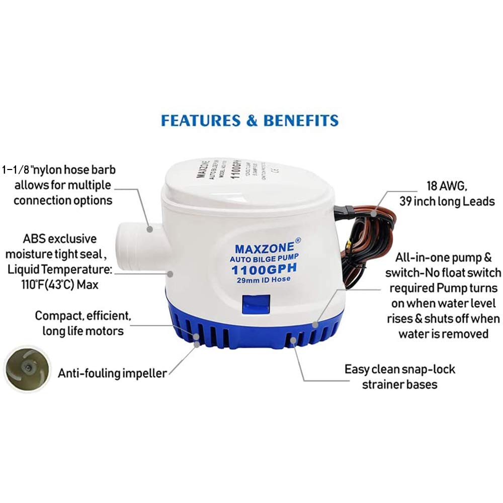 Maxzone Automatic Submersible Boat Bilge Water Pump 12V 1100Gph Auto With Float Switch (Blue - Automatic)