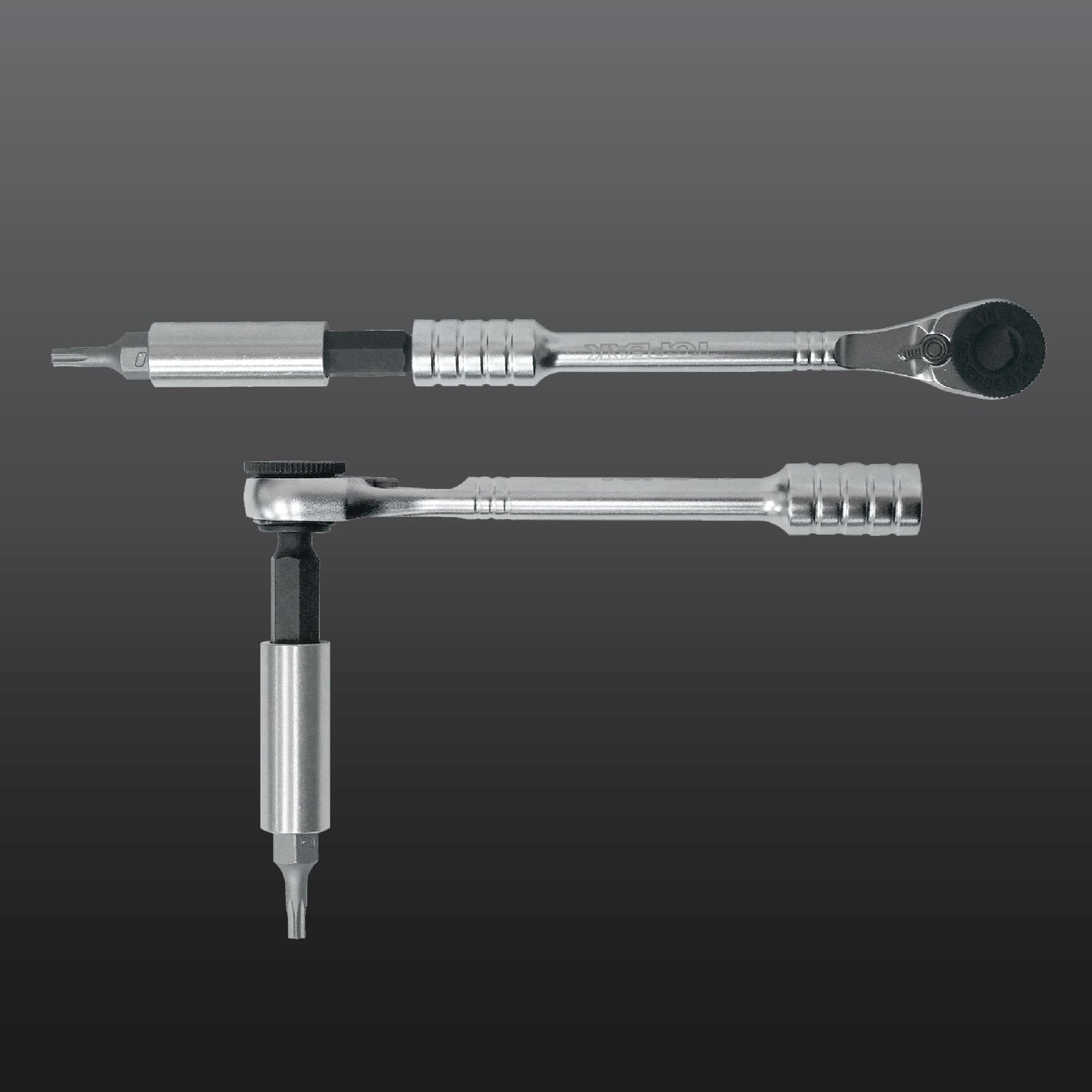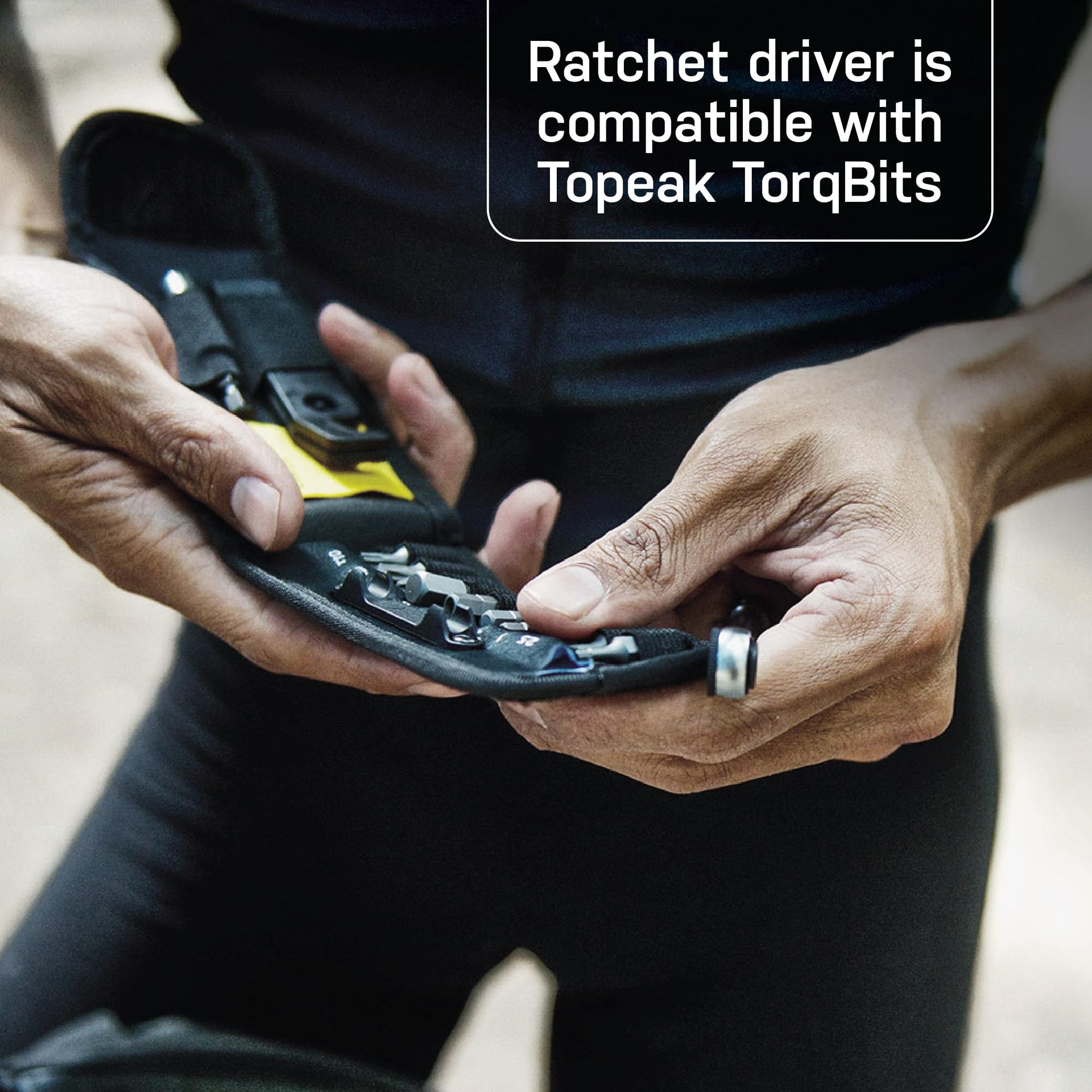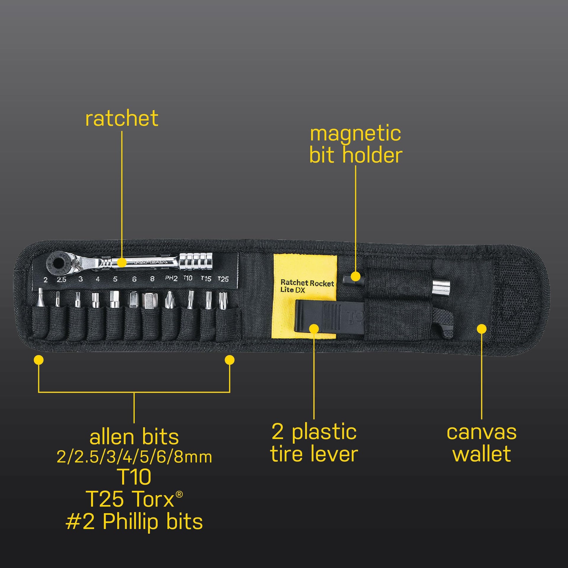 The Topeak Ratchet Rocket Lite DX features a fine-tooth ratchet mechanism with a reverse lever and thumb wheel for quick rotation and control in tight spots. It includes hardened steel tools in 2, 2.5, 3, 4, 5, 6, and 8 mm hex, T10, T15, T25 Torx, and #2 Phillips bits, two engineering-grade polymer tire levers, and a magnetic bit holder.